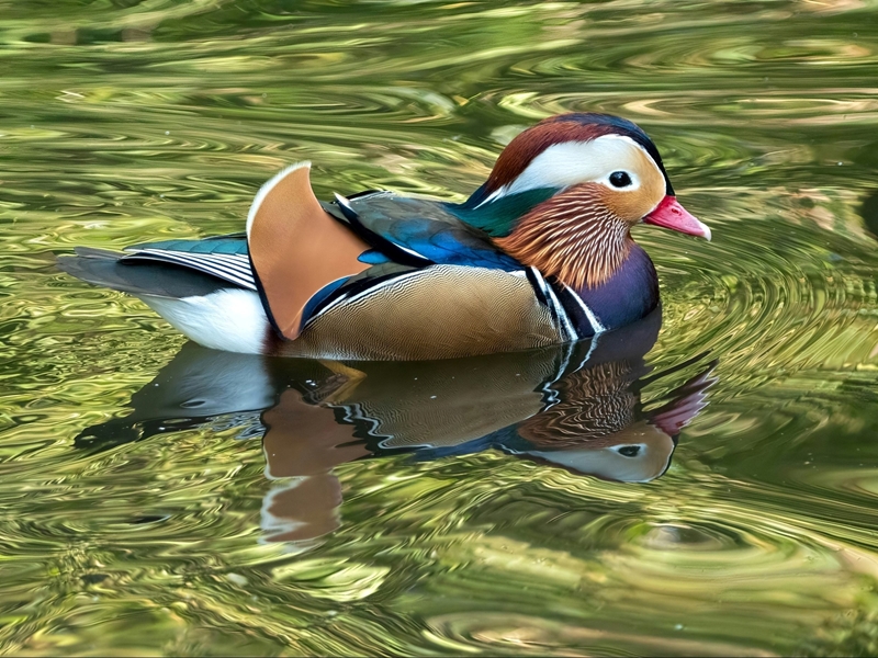 | A mandarin duck glides across the water, its vivid plumage reflected in the green ripples below. The bright reds, blues, and golds shimmer as it moves, turning the pond into a living painting. |