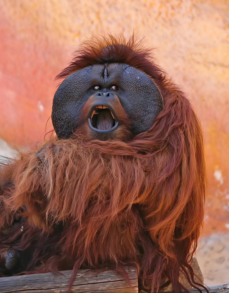 A Bornean orangutan sits slouched on a wooden beam, mouth agape, at Las Įguilas Jungle Park, Tenerife. Male orangutans develop pronounced cheek pads around the age of 15 to 20 years, a secondary sexual characteristic that serves as a sign of maturity and dominance within their social structure. |