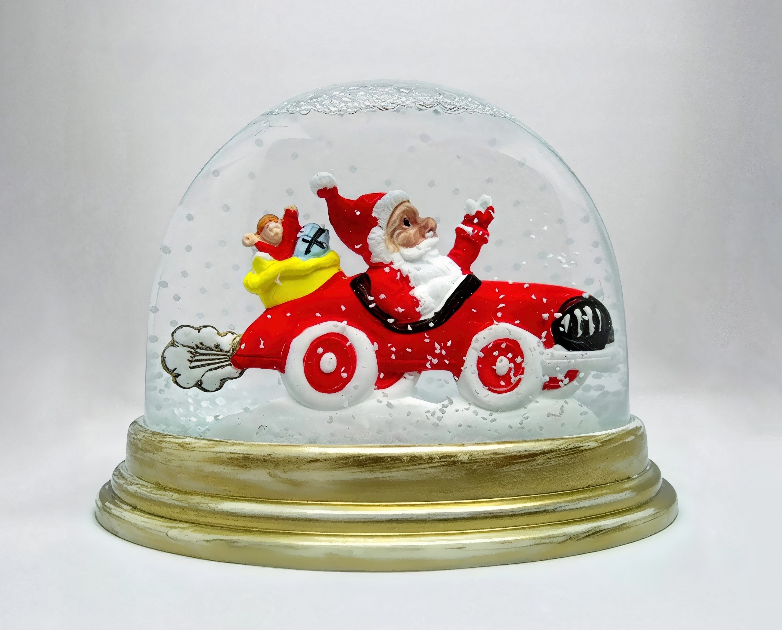 | Father Christmas zooms through the frosty swirl, determined to stay on schedule. Behind him, a bulging sack of toys rests securely in the car’s rear, while his raised hand waves with steadfast holiday spirit. |