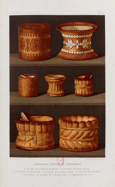 Assorted croustades Chromolithograph by A. Pralon, designed by E. Ronjat From Le livre de pâtisserie, by Jules Gouffé, 1873 Bibliothèque nationale de France
