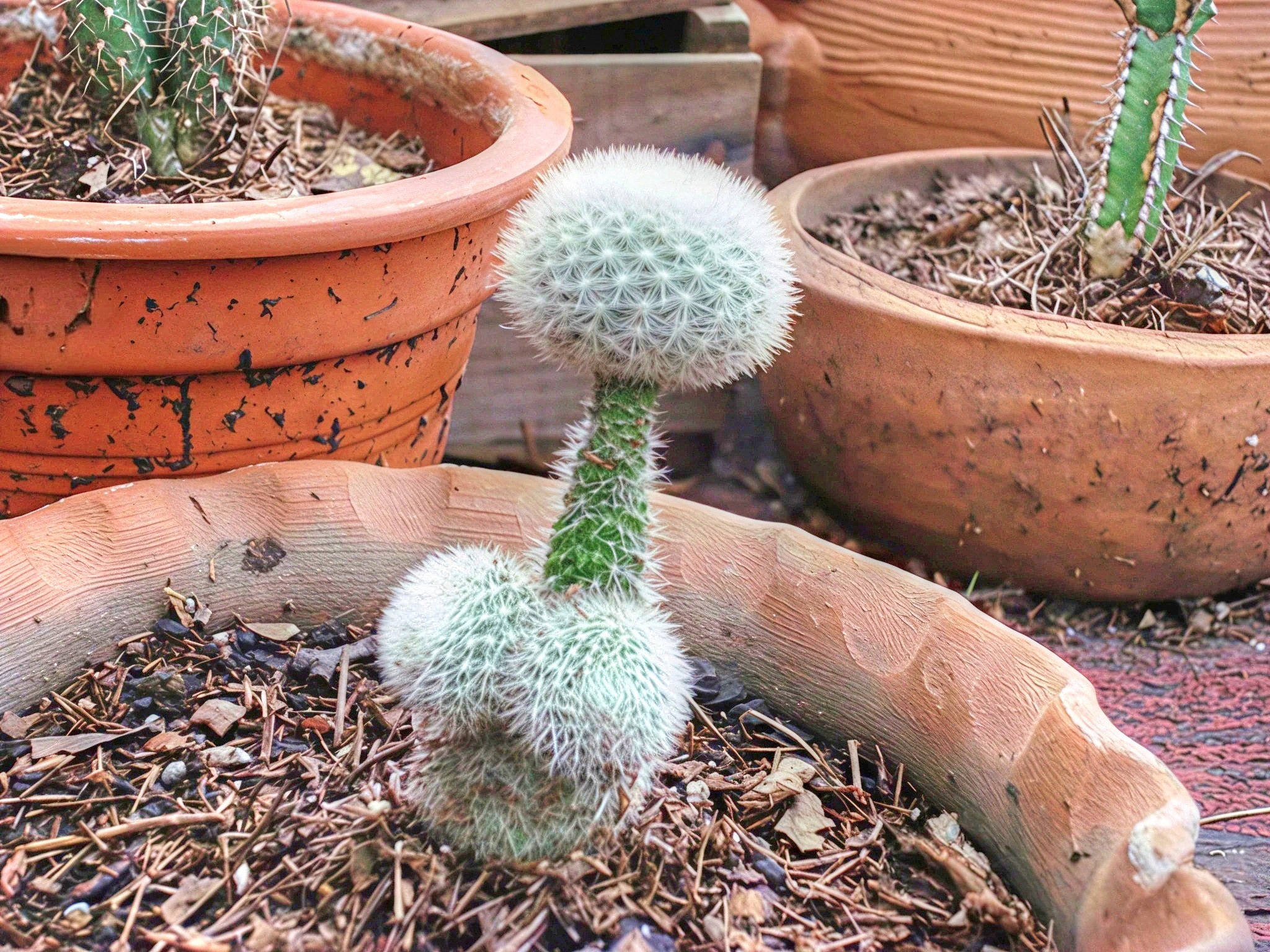 An unusual vertical growth pattern with globular offshoots covered in fine white spines is seen in this miniature cactus. Belonging to the Mammillaria genus, its morphology reflects natural variation or environmental influence.