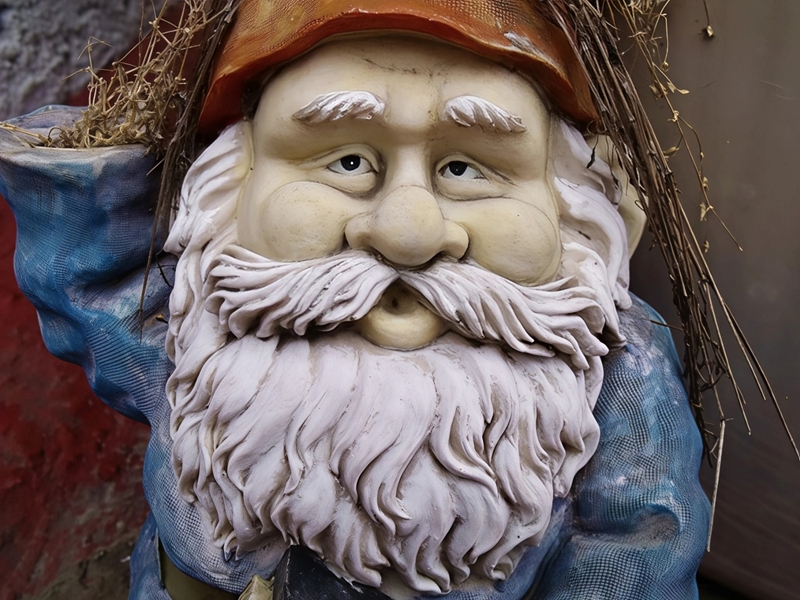 | A weathered garden gnome, with drooping eyes and a wistful expression, looks as though he's seen too many seasons pass. His once-bright blue coat is faded and dusty, a hand is missing, and dried twigs cling to his hat like a forgotten crown. Despite his weary face, the sculpted beard and gentle smirk hint at a lifetime of quiet watchfulness in the undergrowth. |