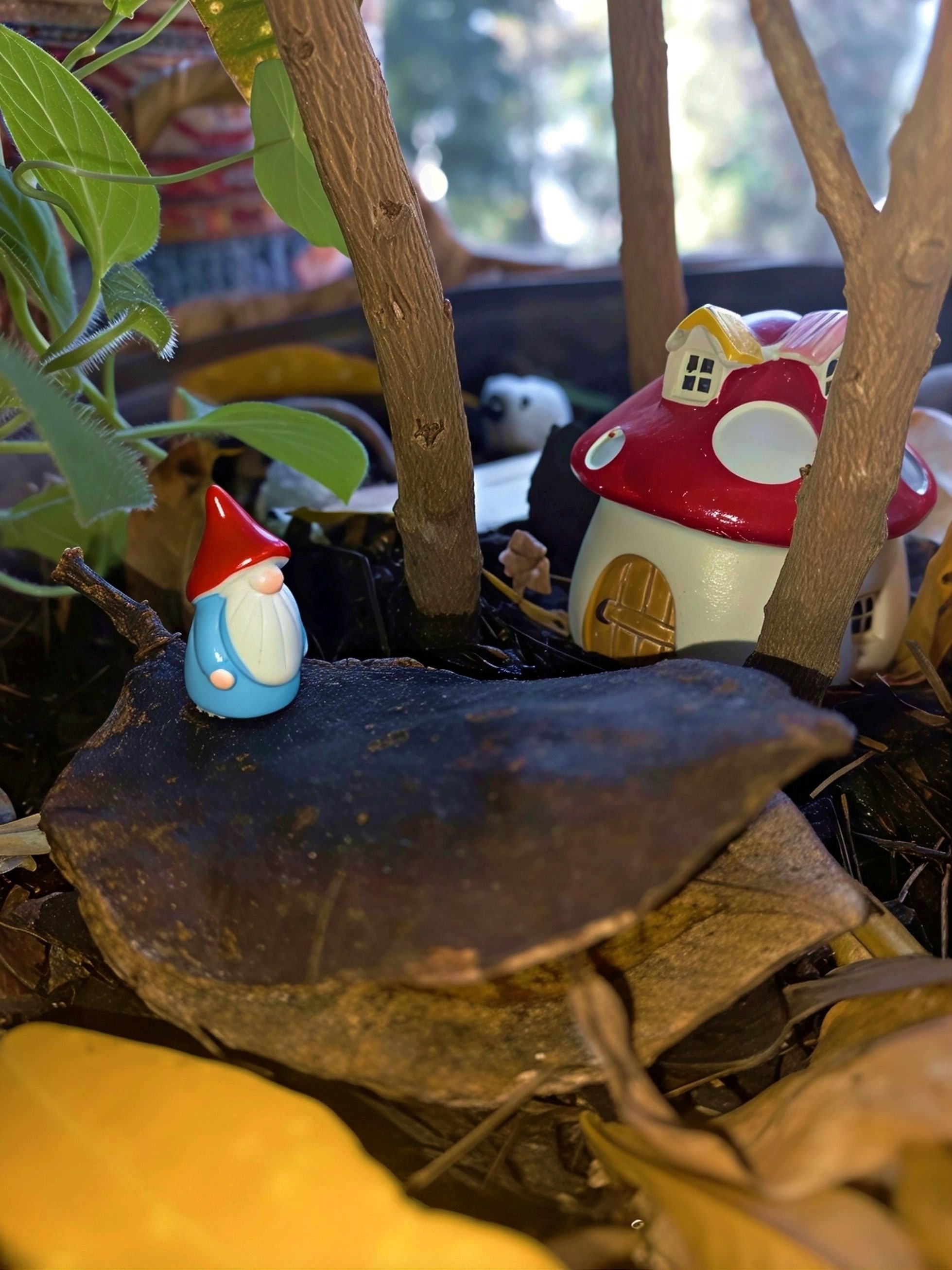 A garden gnome rides a jacaranda pod, not unlike a mission‑bound gondolier, solemn as ceremony. His hat is jaunty; his purpose, not.
