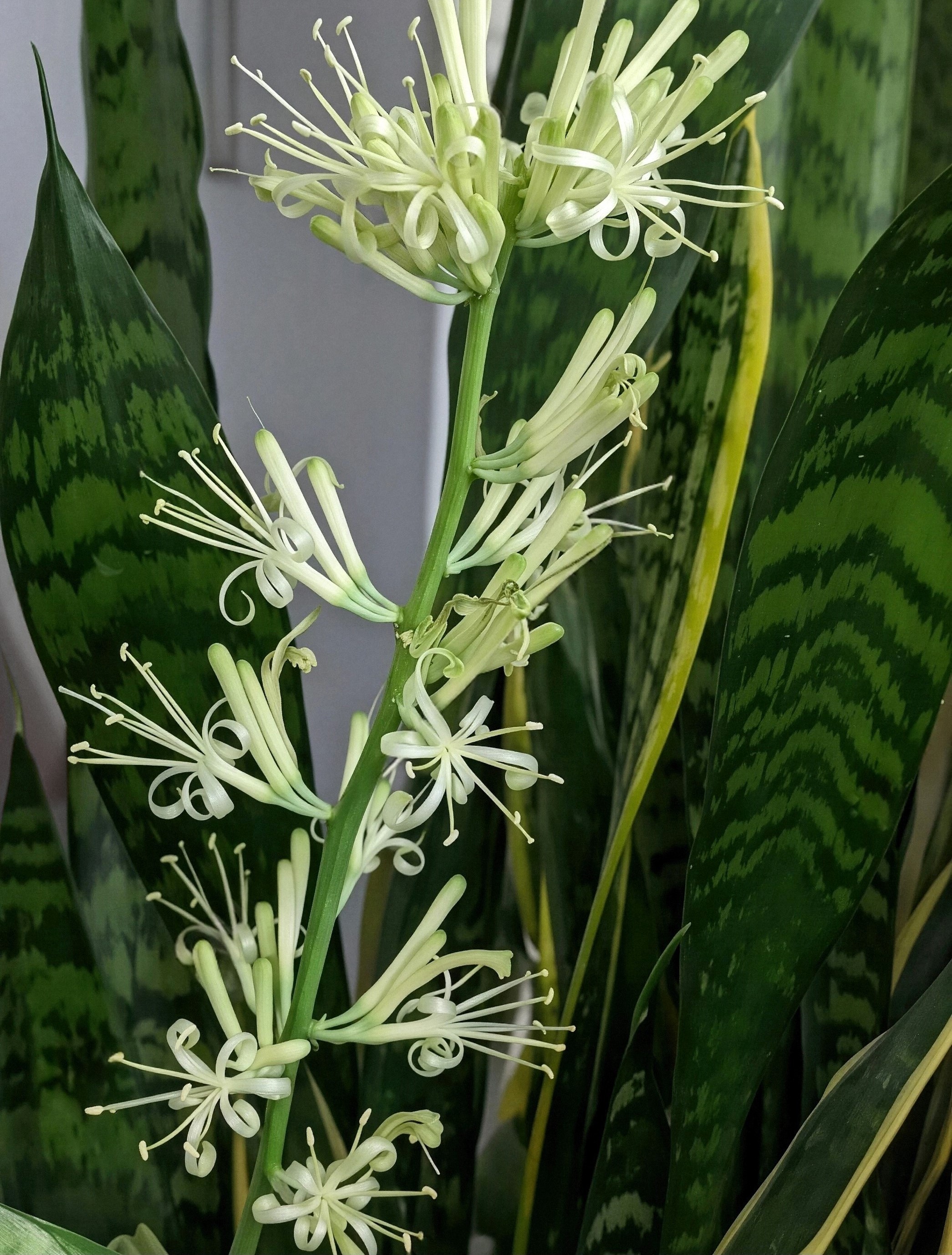 | Dracaena trifasciata (other common names include mother-in-law’s tongue, Saint George’s sword, and viper’s bowstring hemp) is native to tropical West Africa, where it grows in well-drained soils and is adapted to dry conditions. Indoors it rarely flowers, but when it does, it typically produces fragrant, narrow tubular blooms that open into small star-like flowers with slender petals, pale greenish-white to white in colour, usually in mature plants under suitable conditions. |