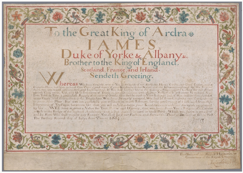 Duke of York, to the King of Ardra Ink on parchment, 36 x 46.5 cm, anonymous artist, 1664 Rijksmuseum, Amsterdam |