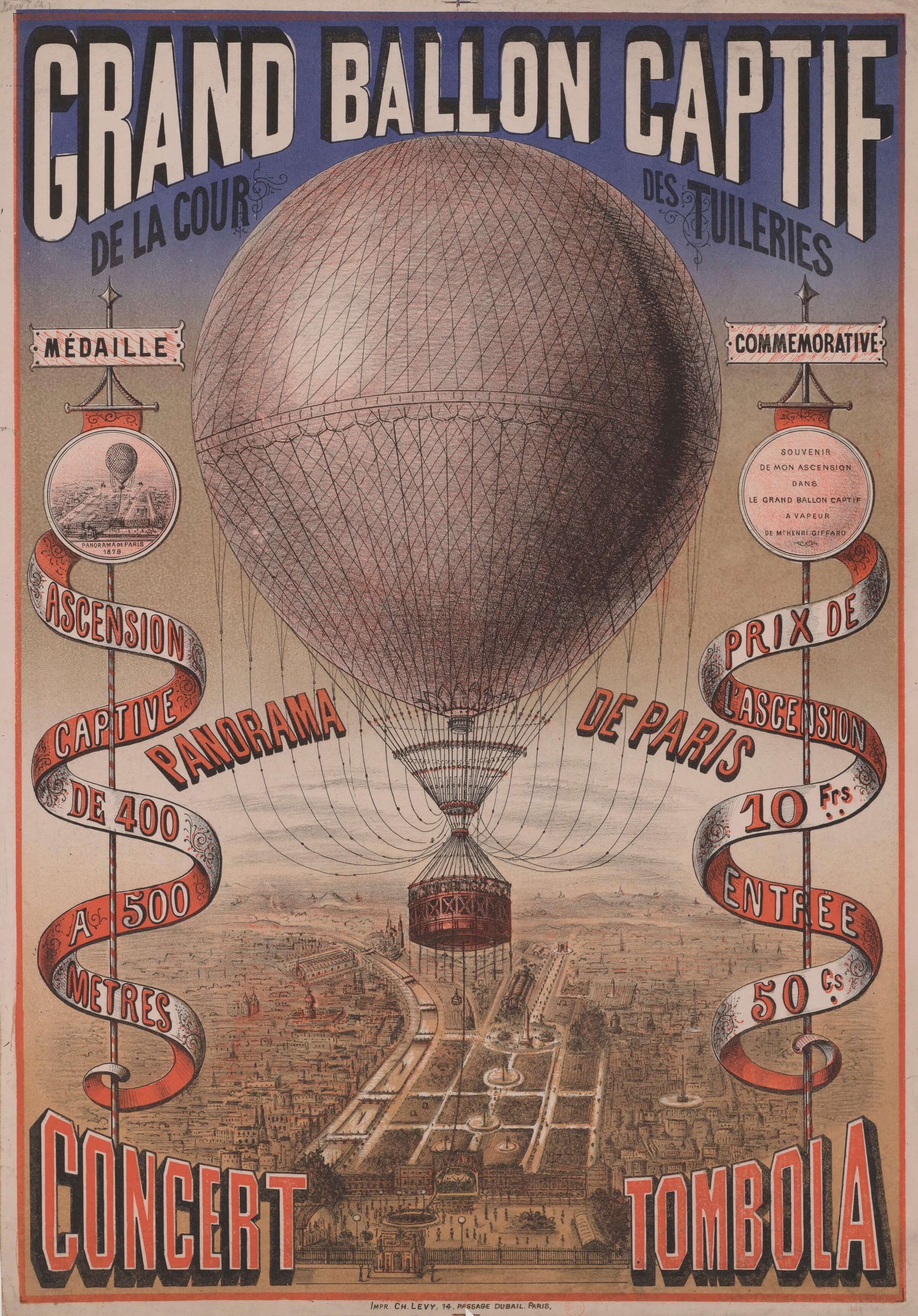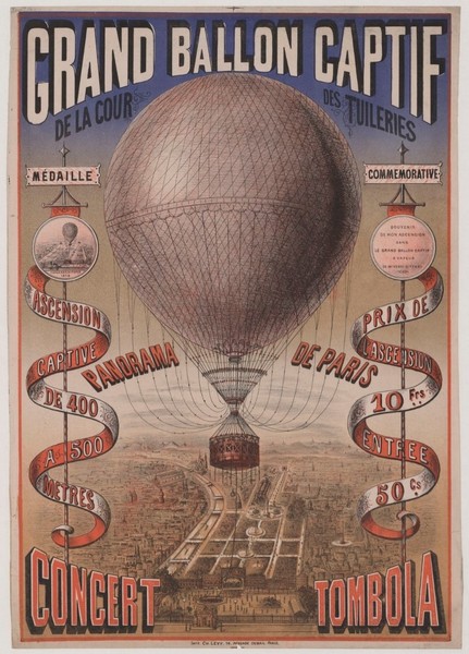 Grand ballon captif de la cour des Tuileries... Concert, tombola Hot-air balloon poster. 1879