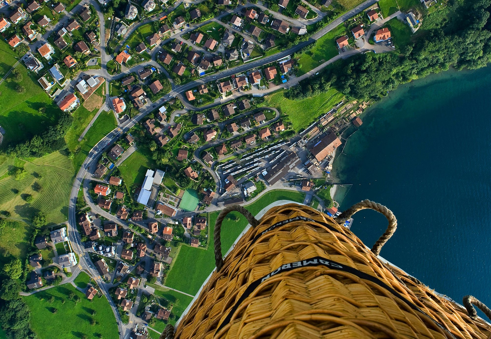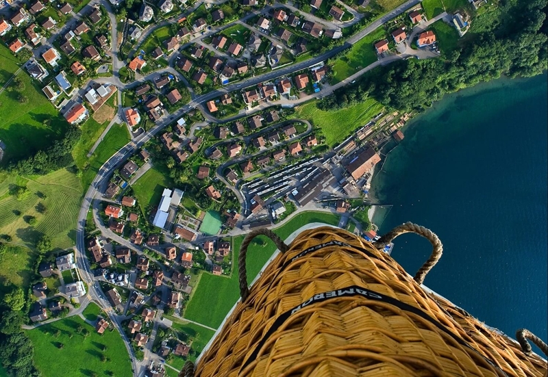 | A peaceful and exhilarating scene from hot air balloon drifting high above a patchwork of winding streets, rooftops, and fields stretching into the distance. Below, the lakeshore glimmers with deep blue waters, where docks and clustered buildings hug the edge of the land. |