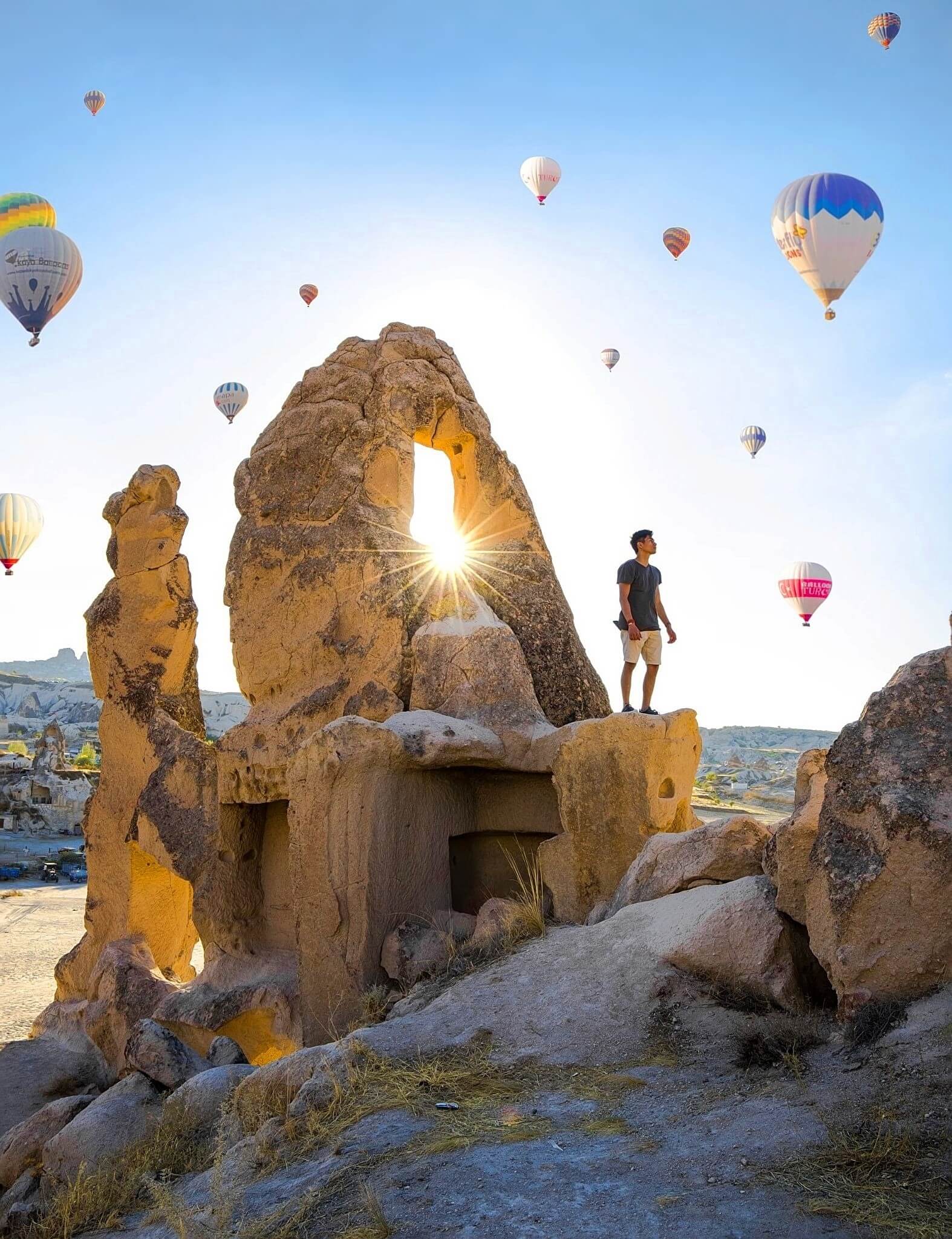 Man standing under balloons Cappadocia, Turkey. Photograph by Canmandawe, 2018