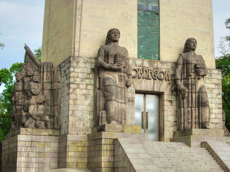 Monument to Alvaro Obregón. Front: allegorical figures of Fertility and Labour. Right flank: Allegory of Sacrifice Granite (sculpture), by Ignacio Asúnsolo, 1935 Parque de la Bombilla, San Ángel, Mexico City