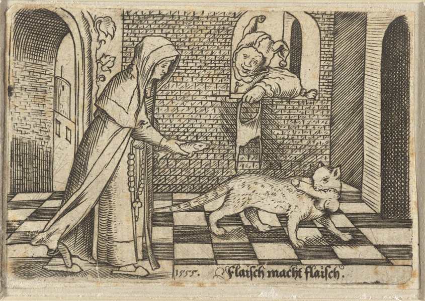 Crude Protestant satire targeting the hypocrisy of Catholic celibacy. A nun runs after a cat with a fish in her hand. She wants to exchange the fish for a penis that the cat has in its mouth. A jester watches through a window frame as he holds her bloomers. |