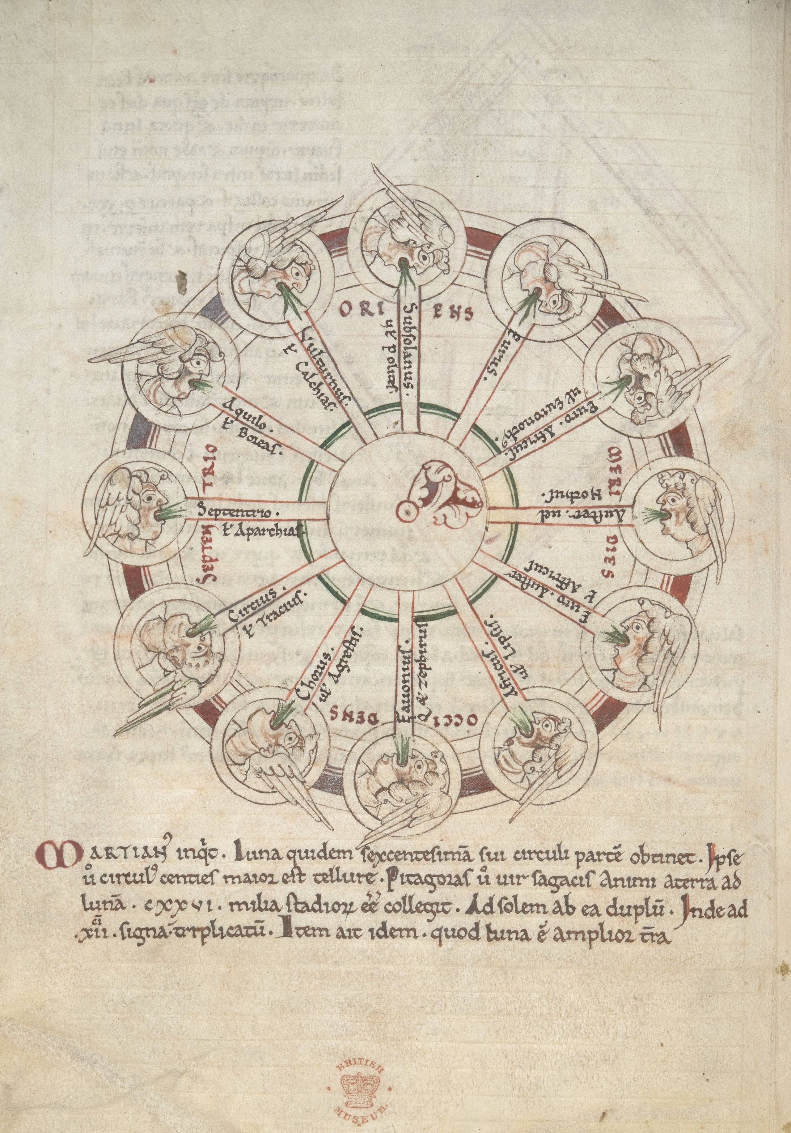 Rota of the Twelve Winds Pen, ink and coloured washes on vellum, from Harley MS 3667, f. 5v, between 1122 and 1135 The British Library |