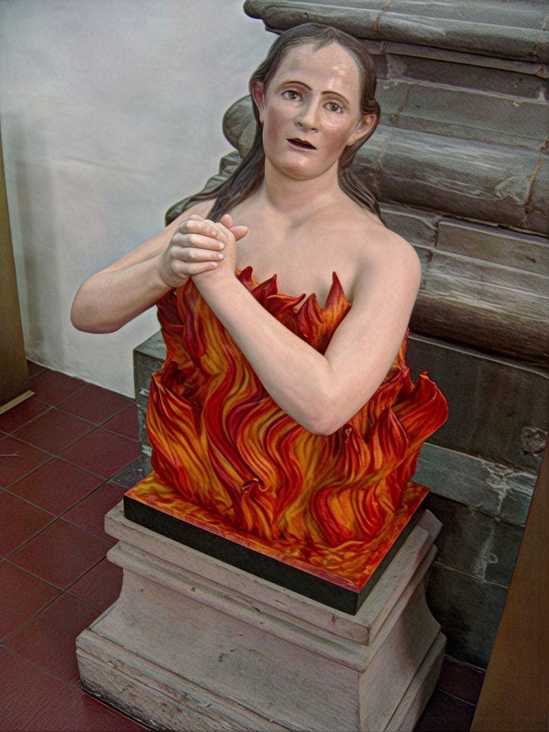 | The Anima Sola (Lonely Soul) is a devotional image in Catholic tradition, often associated with the souls in Purgatory. It typically depicts a solitary figure, usually a woman, shackled in chains, surrounded by flames, and looking upwards in anguish or supplication. This imagery is symbolic, reflecting theological beliefs about Purgatory as a place of purification. The flames represent the cleansing fire that purifies the soul, while the chains signify bondage to sin, with their breaking symbolising the soul's eventual release as it moves towards salvation. Despite the anguish portrayed, the figure’s upward gaze or prayerful posture embodies hope and redemption, emphasising that Purgatory is temporary and that the soul is destined for union with God. Depictions of men in the context of the Anima Sola or souls in Purgatory are less frequent but are certainly present, especially in broader Catholic art. Male figures are typically shown in group compositions rather than as solitary individuals, symbolising the collective nature of humanity’s journey through purification. The Anima Sola serves as a reminder of mortality and the importance of living virtuously, inspiring prayers for the souls in Purgatory, as these prayers are believed to expedite their journey to Heaven. In some cultural contexts, particularly in folk Catholicism across Latin America and the Caribbean, it has taken on mystical or superstitious associations, being invoked for personal or occult purposes such as seeking justice or resolving conflicts, though such practices fall outside official Catholic doctrine. |