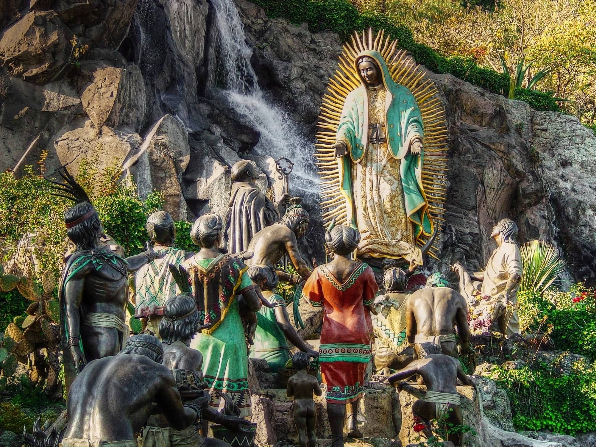 | The Offering is located in the Tepeyac Garden on the eastern slope of the Hill of Tepeyac in Mexico City, which also contains the Chapel of the Hilltop and a cemetery. The Hill of Tepeyac, once home to a temple dedicated to the Aztec goddess Tonantzin, became a site of Christian worship following the Virgin's apparition. The Basilica of Our Lady of Guadalupe stands at the foot of the hill. The Offering was inaugurated in 1986 and features a towering, nearly four-metre-high figure of the Virgin of Guadalupe, positioned at the centre of the garden, with two waterfalls flowing behind her. Surrounding her is a sculptural group consisting of 16 other bronze-cast figures, including Fray Juan de Zumárraga, Juan Diego, and others who present offerings to her. This work was commissioned by the Basilica of Guadalupe in 1982 and designed by 82-year-old Aurelio Mendoza, a scenic artist, architect, and painter. Mendoza, known for his expertise in creating visually powerful scenes, brought a dramatic, symbolic presence to this monument, which serves as a tribute to the apparitions of the Virgin that took place in 1531. The design reflects the blending of indigenous and Spanish cultural influences and religious traditions in Mexico. The monument is situated near the Fountain of Quetzalcoatl, a basin that, according to legend, marks the sites of the second and third apparitions. |