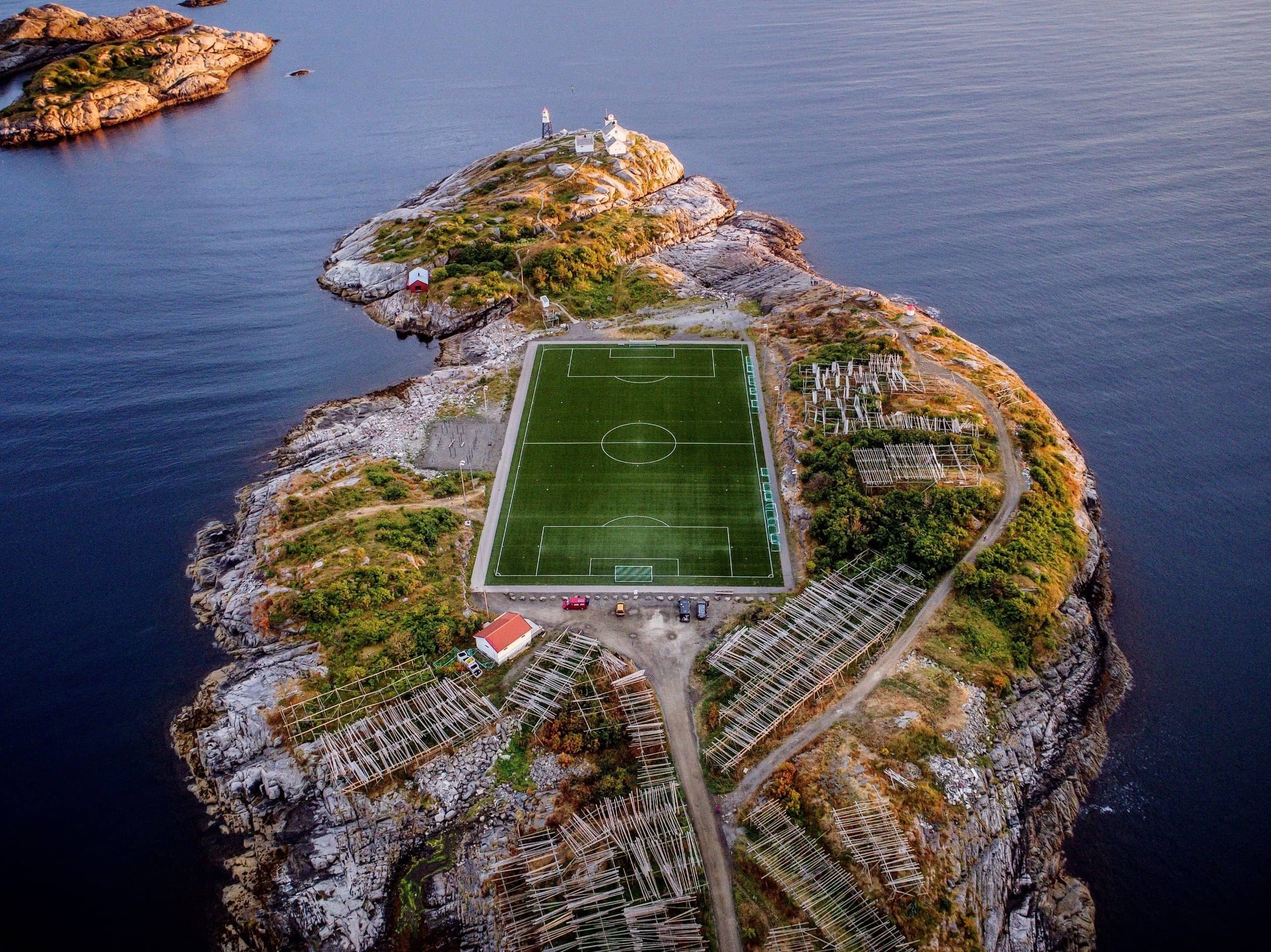 cod-drying industry. The field is surrounded by the sea and dramatic