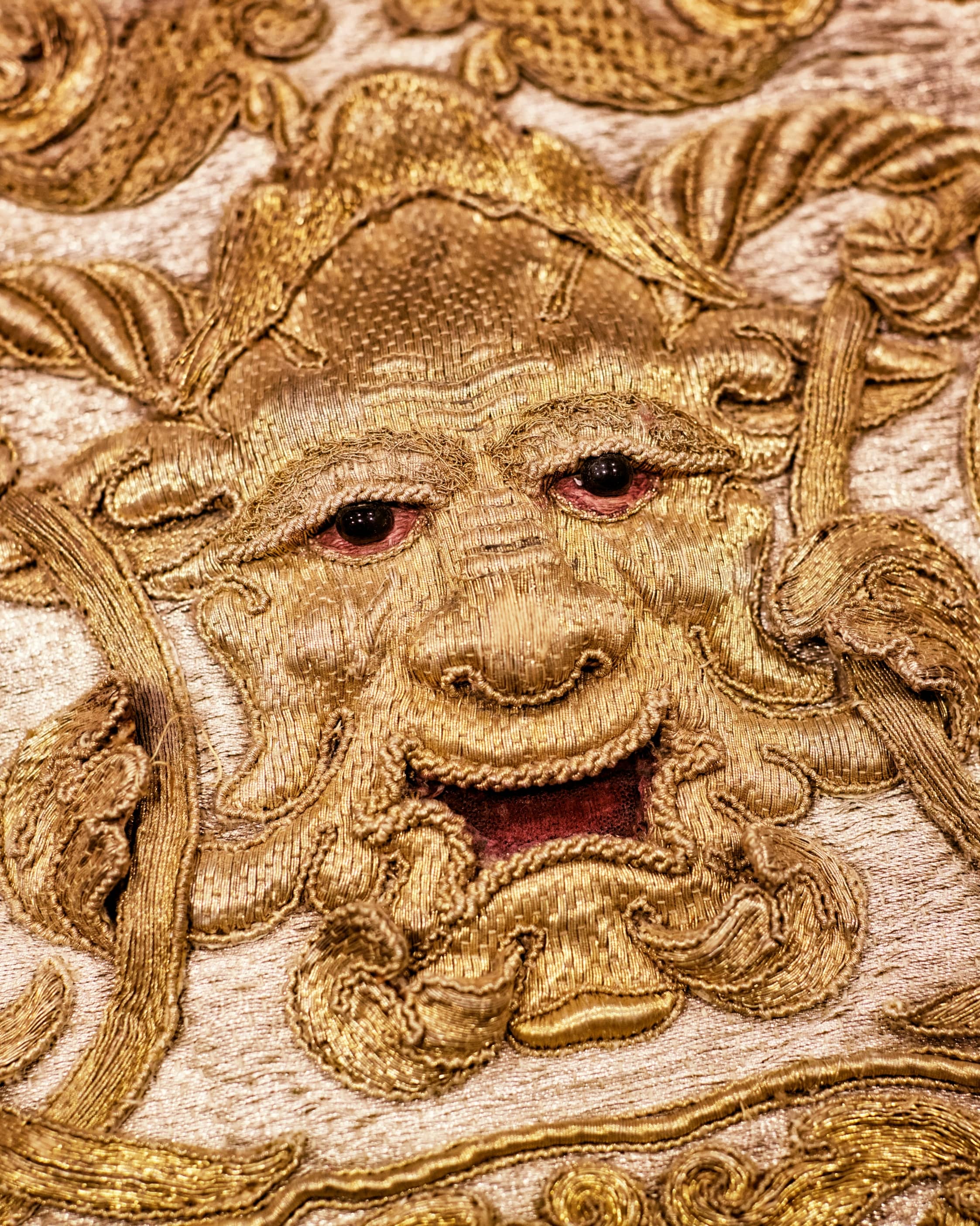 | This saddle pad, used to cushion and protect the horse’s back, is fully embroidered in relief, using gold and silver threads and cords. The pattern consists of acanthus leaf-like loops intertwined with bell-shaped flowers. In the centre of the back, a grotesque mask is depicted in heavy relief, with eyes made of black glass beads and a wide gap inside filled with red velvet. In the rounded corners, three grotesque masks are shown: one smaller and facing forward, and two larger in profile, one of which has an extended bone tongue wrapped with red linen yarn and gold thread. The embroidery is worked with sewn-in gold threads and cords, placed against a backdrop of sewn-in silver cords. A thick cord wrapped in gold thread separates the border from the rest of the embroidery. The border features leaf loops and flowers, with a gaping mask in each rounded corner. The saddle pad is finished with ribbon of gold linen and lined with coarse, unbleached linen. |