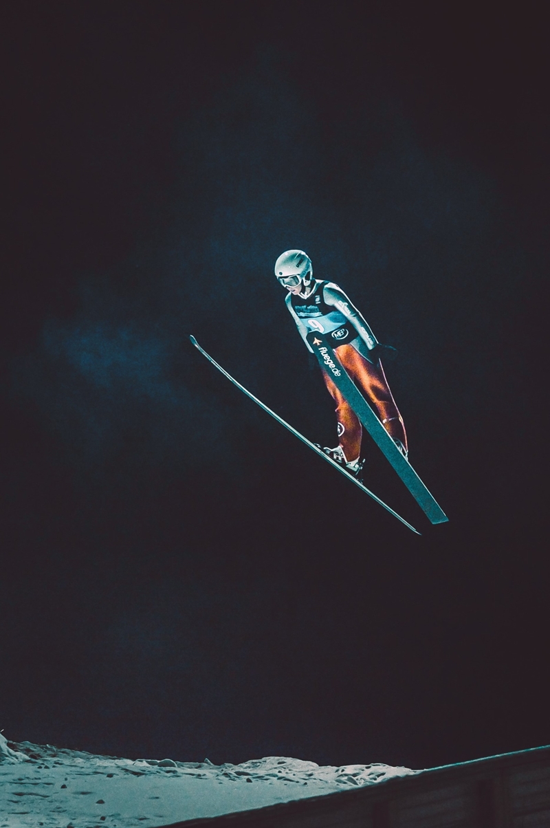 | A precise aerodynamic V-style position is maintained by the ski jumper while soaring through the air. Their long skis are angled sharply outwards to catch the air and maximise the distance of the jump before they descend towards the snowy landing slope. |