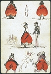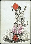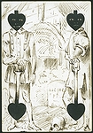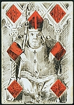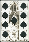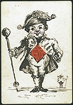 | A collection of 19th-century playing cards from various decks, featuring a mix of traditional and highly decorative designs, many with hand-drawn illustrations that creatively incorporate suit symbols. The set consists of 16 cards, each measuring 9.2 x 6.5 cm, printed and coloured with pen and ink. Several cards depict anthropomorphic characters—such as jesters, aristocrats, and soldiers—whose clothing or accessories integrate hearts, clubs, diamonds, and spades. Others feature floral motifs or symmetrical geometric patterns on their backs. Notably, one card from a British Museum sample sheet dated 1867 provides a fine example of period design. The collection reflects the Victorian fascination with intricate ornamentation and playful reinterpretations of traditional card elements. | ||||||||||