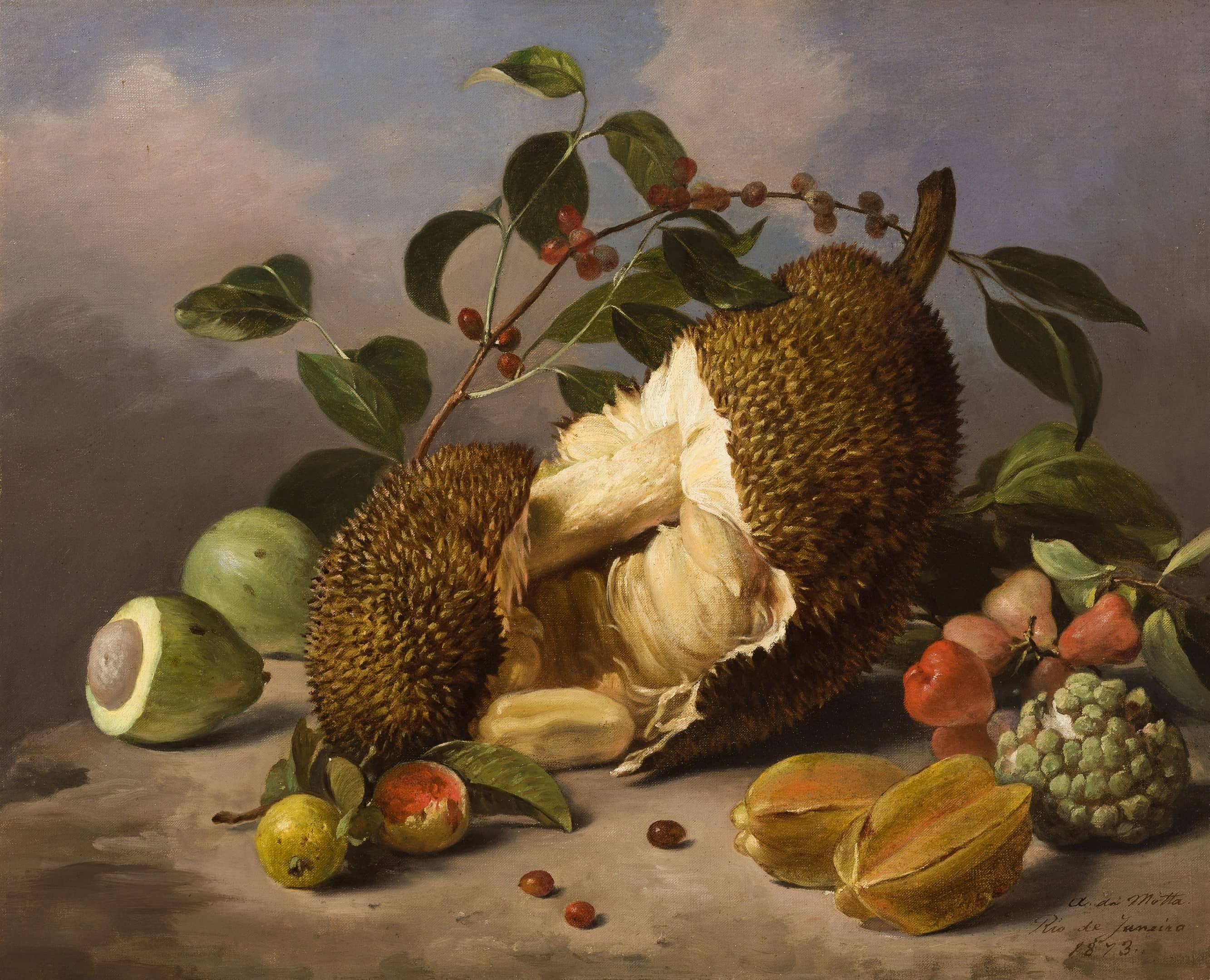 | Still lifes traditionally carry soft traces of passing time: the drooping flower, the petal that has fallen, the blemish, the worm’s slow mark—gentle signs that splendour fades and nothing is spared the quiet work of time. Yet Motta’s scenes seem untouched by such decline. His fruits hold their boldness, their heat, their wildness, as if the season lingers and the sun refuses to set. Here, jackfruit, guava, custard apple, pine cone, pitanga, star fruit, and avocado sit together in the scene, their rough skins, soft flesh, and shifting colours carefully displayed, each offering a hint of its taste, scent, and texture, presented as a lasting, ever-present reality that seems to resist fading. |