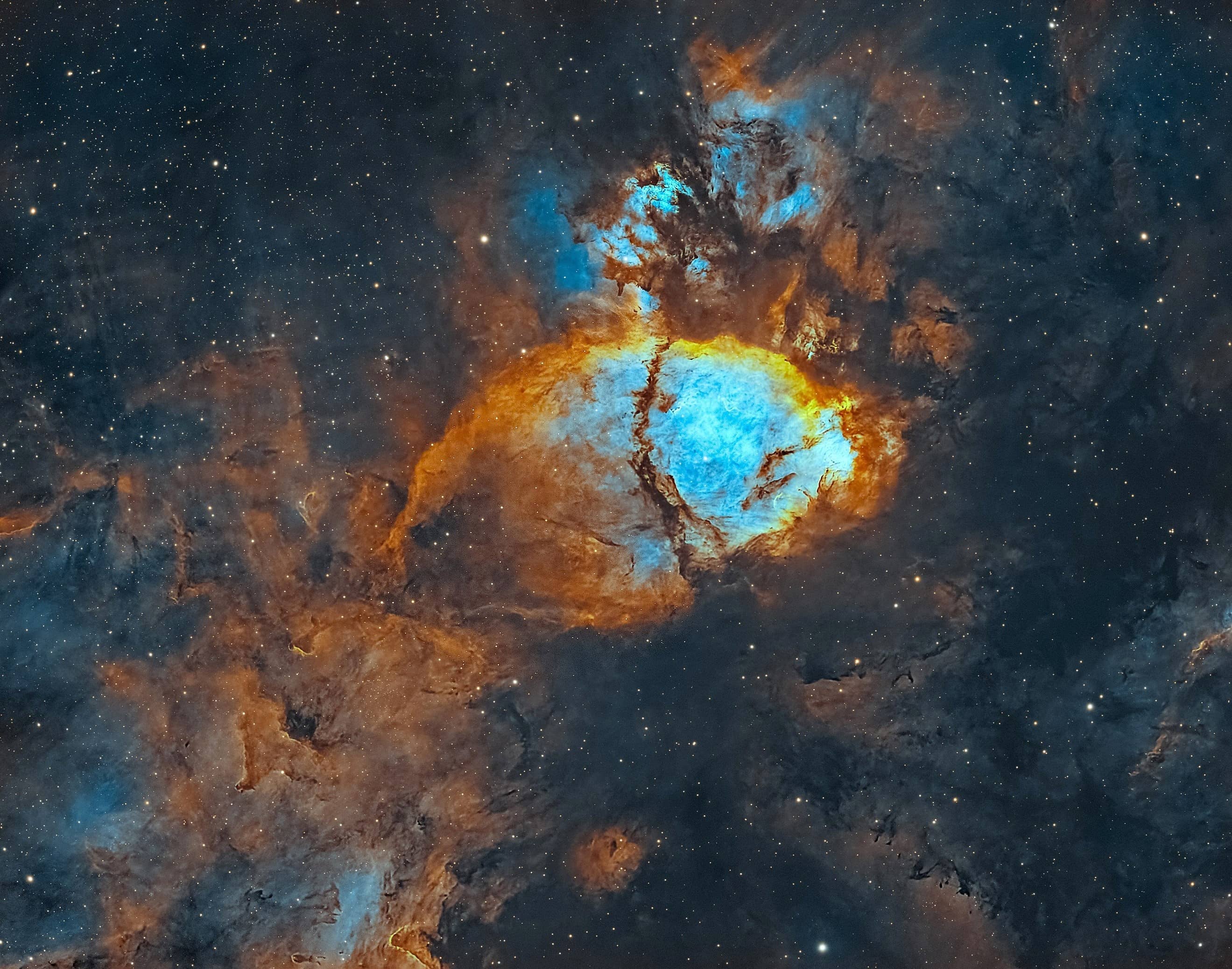 | Glowing gas and obscuring dust clouds in IC 1795, nicknamed the Fish Head Nebula because of its shape, form a star-forming region in the northern constellation Cassiopeia. Located about 6,000 light-years from Earth, the nebula consists mainly of ionised hydrogen, along with traces of oxygen and sulfur, which give it its characteristic reddish and greenish hues. This nebula is part of a larger star-forming complex that sprawls along the Perseus spiral arm of our Milky Way Galaxy. The image was captured using narrowband filters—H‑Alpha, O‑III, and S‑II—and processed using the Hubble Palette. |
