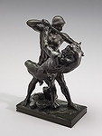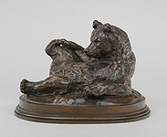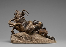 | A Romantic French sculptor and painter, Barye, like many sculptors of the Renaissance, began his career as a goldsmith. After studying under Bosio, the sculptor, and Gros, the painter, he was admitted to the École des Beaux-Arts in 1818. However, it was not until 1823, while working for Fauconnier, the goldsmith, that he discovered his true calling. Observing the wild beasts in the Jardin des Plantes, he made vigorous pencil studies worthy of Delacroix before modelling them in sculpture on both large and small scales. In 1831, he exhibited Tiger Devouring a Crocodile, and by 1832, he had developed a distinctive style, as seen in Lion and Snake. Despite enduring constant financial struggles, Barye continued to exhibit his animal studies—admirable groups that reveal his deep sense of romance and appreciation for classical beauty, as exemplified in Theseus and the Minotaur (1847), Lapith and Centaur (1848), and numerous smaller works now highly valued. Barye was equally successful in small-scale sculpture, excelling in the depiction of animals in their most characteristic poses. His larger works include The Lion of the Column of July, for which the plaster model was cast in 1839, various lions and tigers in the Tuileries Gardens, and the four allegorical groups—War, Peace, Strength, and Order (1854). In 1852, he cast his bronze Jaguar Devouring a Hare. He was appointed professor at the museum in 1854 and elected to the Academy of Fine Arts in 1868. Barye is primarily known for his sculptures, but he was also a skilled painter, with his watercolours and oils often featuring dramatic scenes of predators and prey, reflecting the same energy and attention to detail seen in his three-dimensional works. The vast body of remarkable work he left behind establishes him as the greatest French animal sculptor and the founder of a new artistic tradition, which influenced artists such as Frémiet, Peter, Cain, and Gardet—rightly considered his most distinguished followers. | ||||||||||