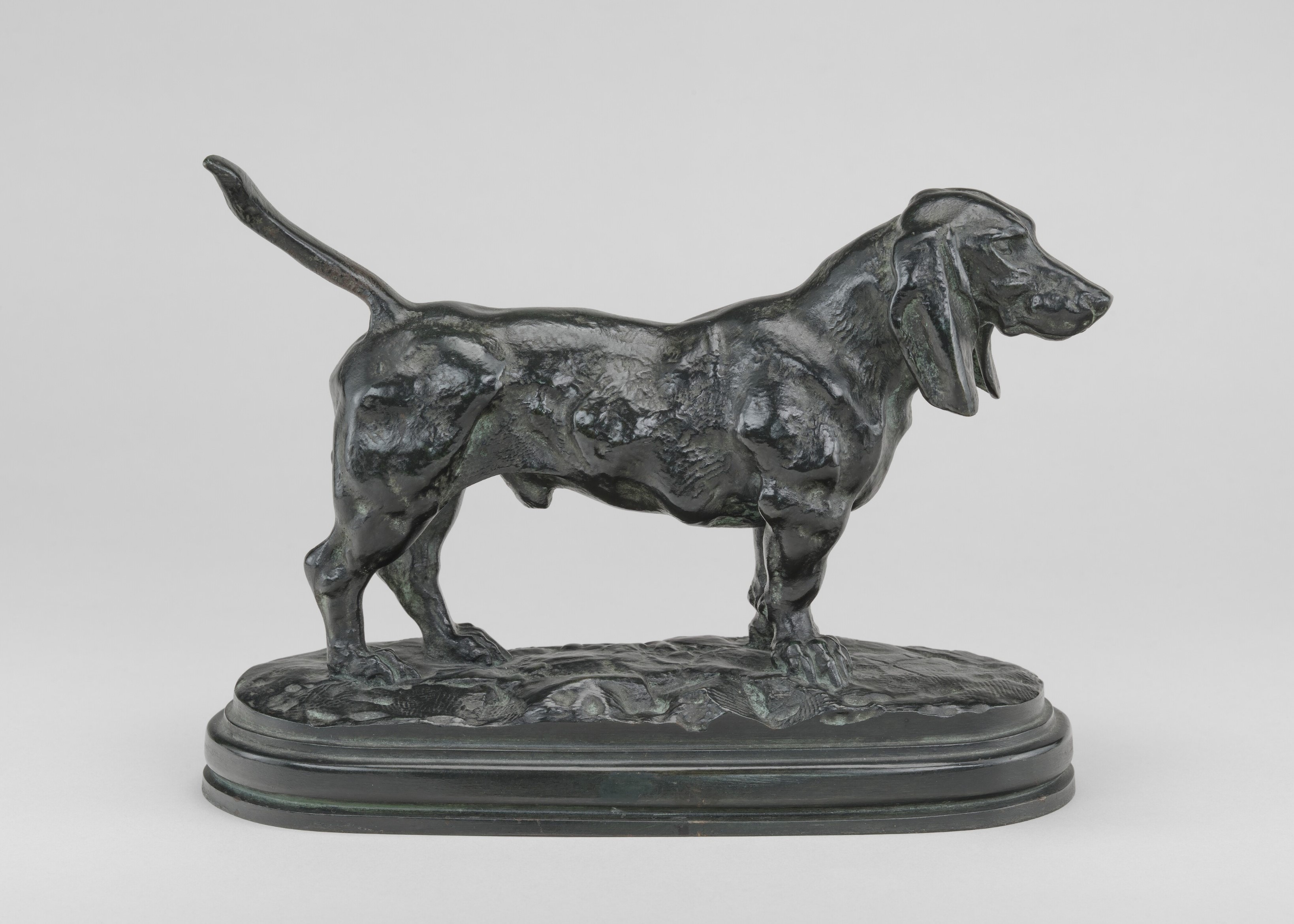 | This English Basset stands in a poised, level stance, its head extended forward and parallel to the back, with long ears draping naturally beside the face. Barye’s use of a rough-textured surface animates the figure with a sense of latent movement, eschewing polish in favour of a more vigorous and tactile handling of the bronze.