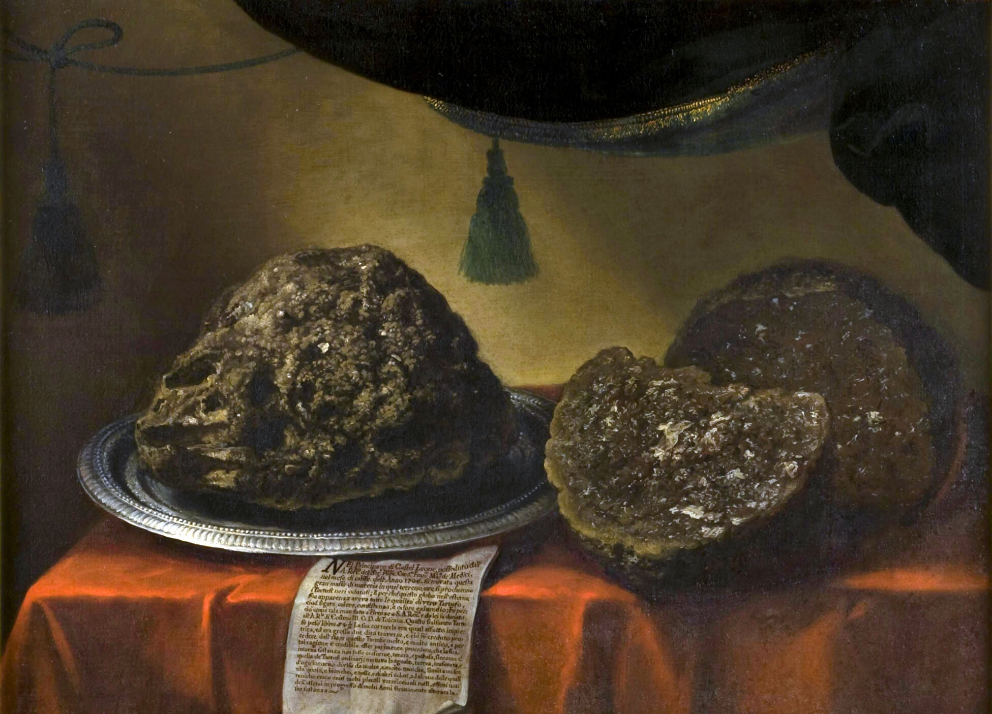 | Tartufo di Castel Leone was commissioned by Grand Duke Cosimo III de’ Medici. After the truffle featured in the painting was discovered, he instructed Bimbi to create a picture of it for his collection at the Villa Medicea. The Duke gave clear instructions on how he wanted the large, ball-shaped truffle depicted. At his request, the truffle was dissected, revealing it was not a single entity but a cluster of smaller truffles bound together by black soil. They were then separated and were found to be very similar in taste, smell, and colour, but they were infested with worms, Following the advice of the Pope's physician, nobody was allowed to consume them. After the painting was completed, the truffles were tossed into the river. The composition illustrates the truffle whole on the left and sliced open on the right. The cartouche in the painting gives this description: 'In the Principality of Castel Leone, owned by His Most Reverend Highness, the Prince Cardinal Francesco Maria de’ Medici, in the month of October of the year 1706, this large mass of material was found in the ground where fragrant black truffles are produced. And because this globe, in its external appearance, had all the qualities of a true truffle—namely its shape, colour, consistency, and even smell—it was therefore sent as such to Florence to His Royal Highness Cosimo III, Grand Duke of Tuscany. This enormous truffle weighed 4 ½ pounds. Its outer layer was almost entirely petrified and was two fingers thick, which was believed to be due to this truffle being very, very ancient. For this reason, it is likewise believed that its internal substance was not uniform, soft, and pasty like that of ordinary truffles, but instead irregular, earthy, perforated, and divided all around by many, many layers resembling thin leather, in white, red, and other colours. Some of these layers were joined by many small red worms, all of which were considered effects of the substance being strangely altered over the course of many years.' |