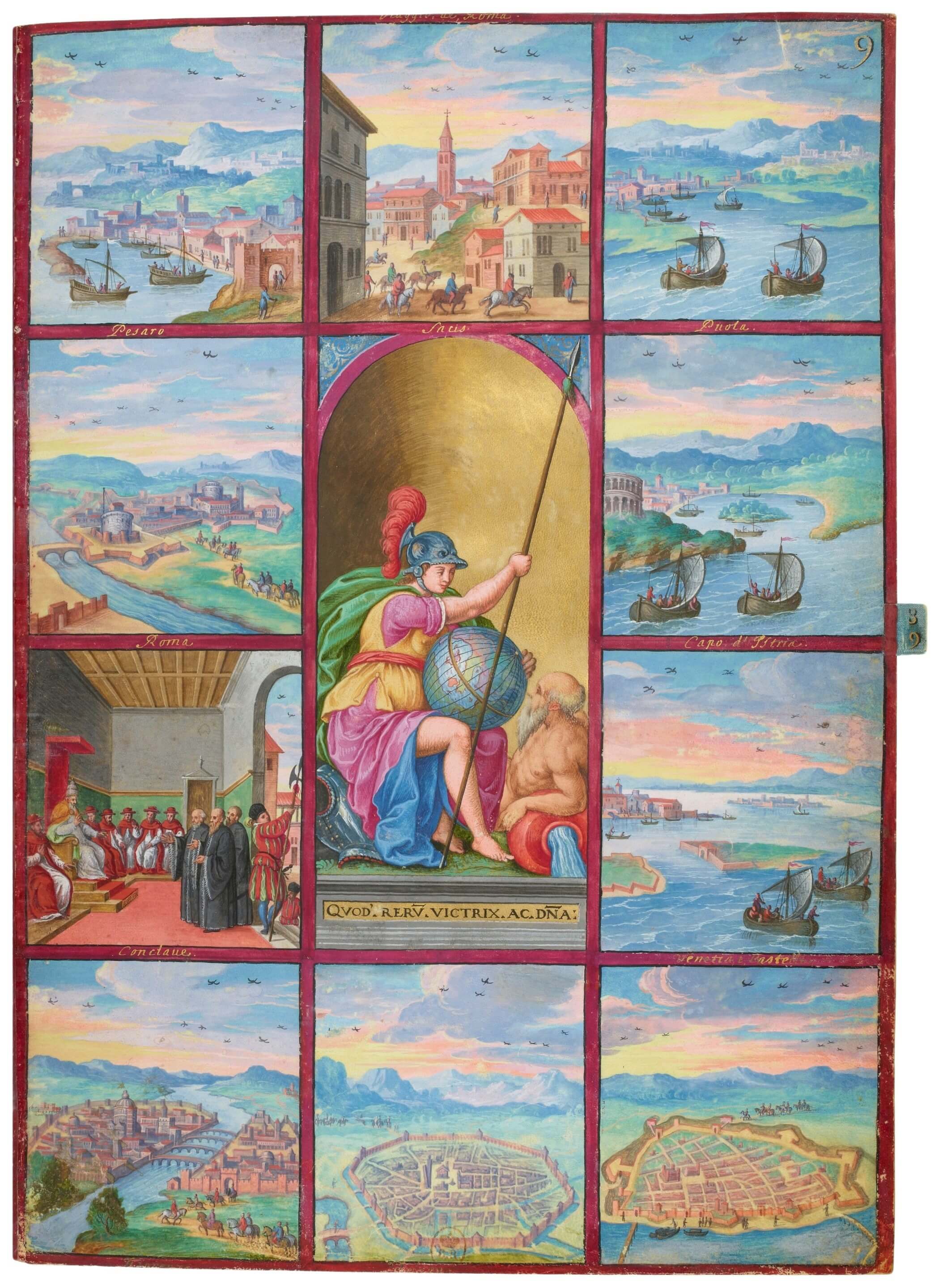 of the world'. Smaller paintings: 1) Port and city of Pesaro. 2) Rome