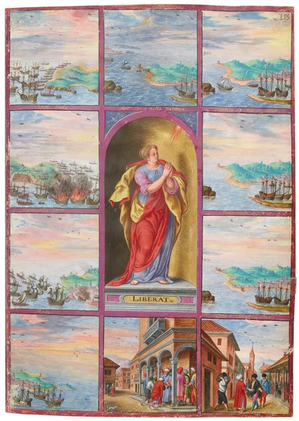 Centrepiece: Personificaton of Liberty. Smaller paintings: 1) Turkish