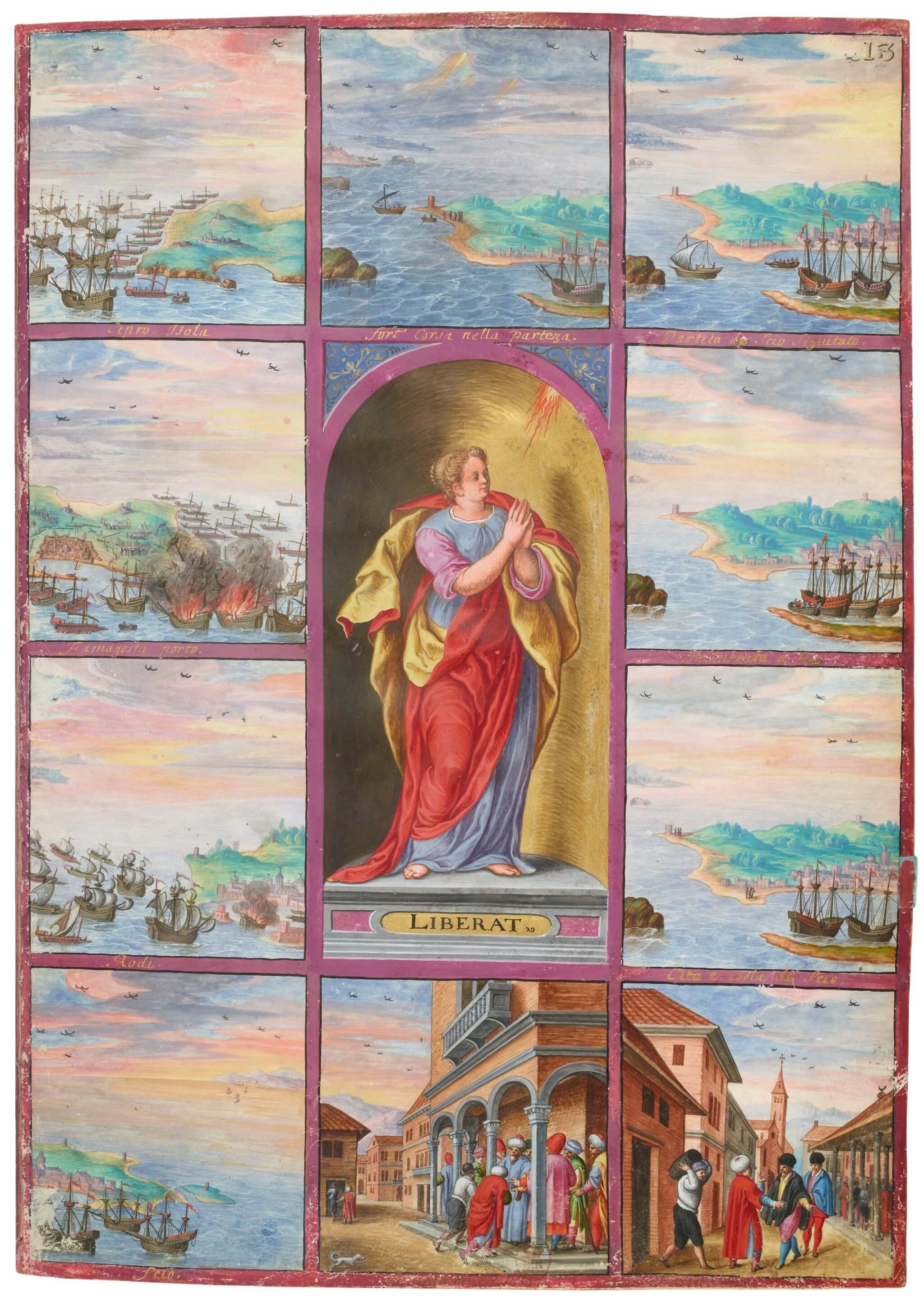 two vessels in flames. 3) Port of Rhodes with a vessel in flames.