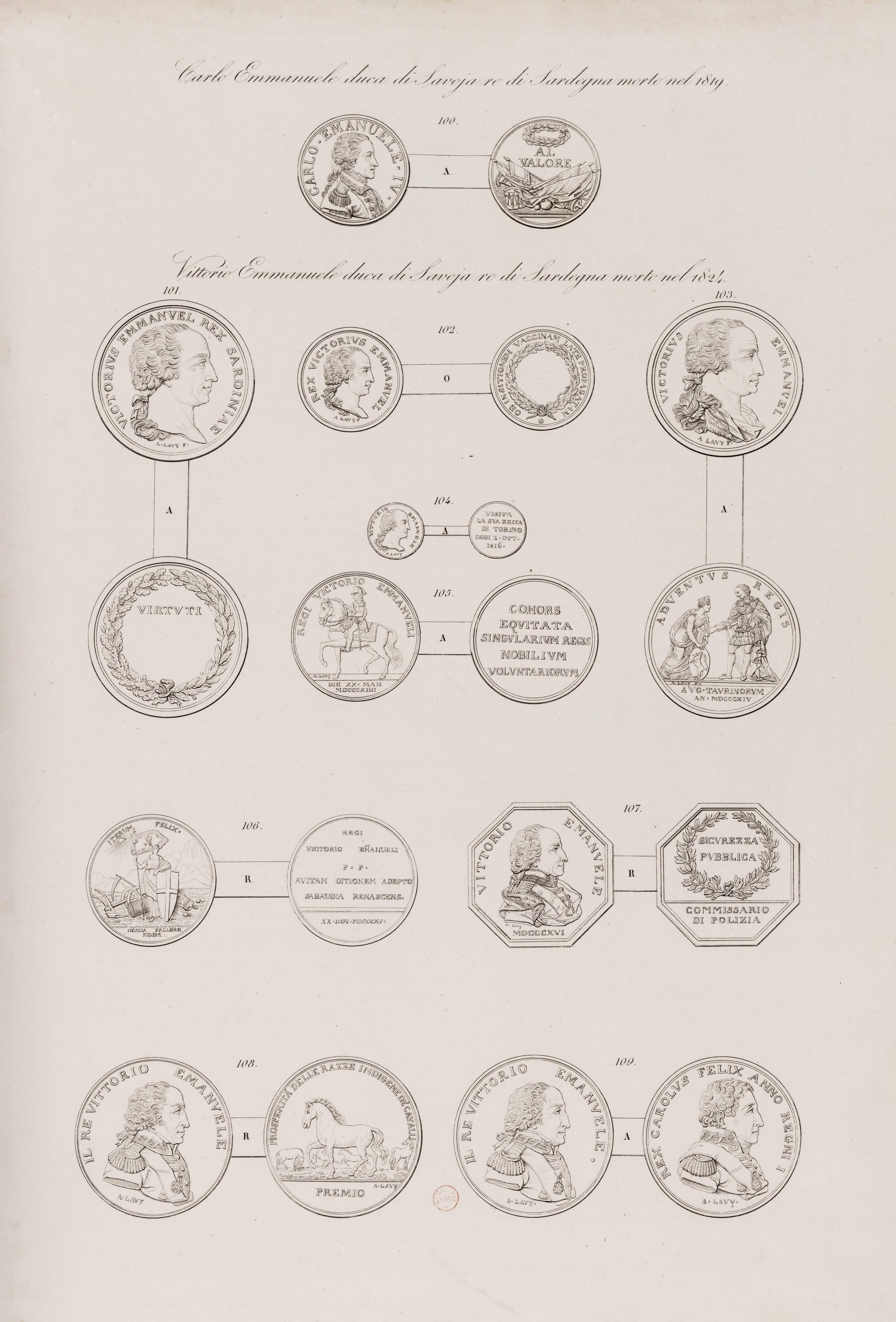 Medals depicting Carlo Emanuele IV, Duke of Savoy and Vittorio Emanuele I, King of Sardinia Engraving, by Antonio Bramati, published 1819 Bibliothèque nationale de France, Paris