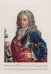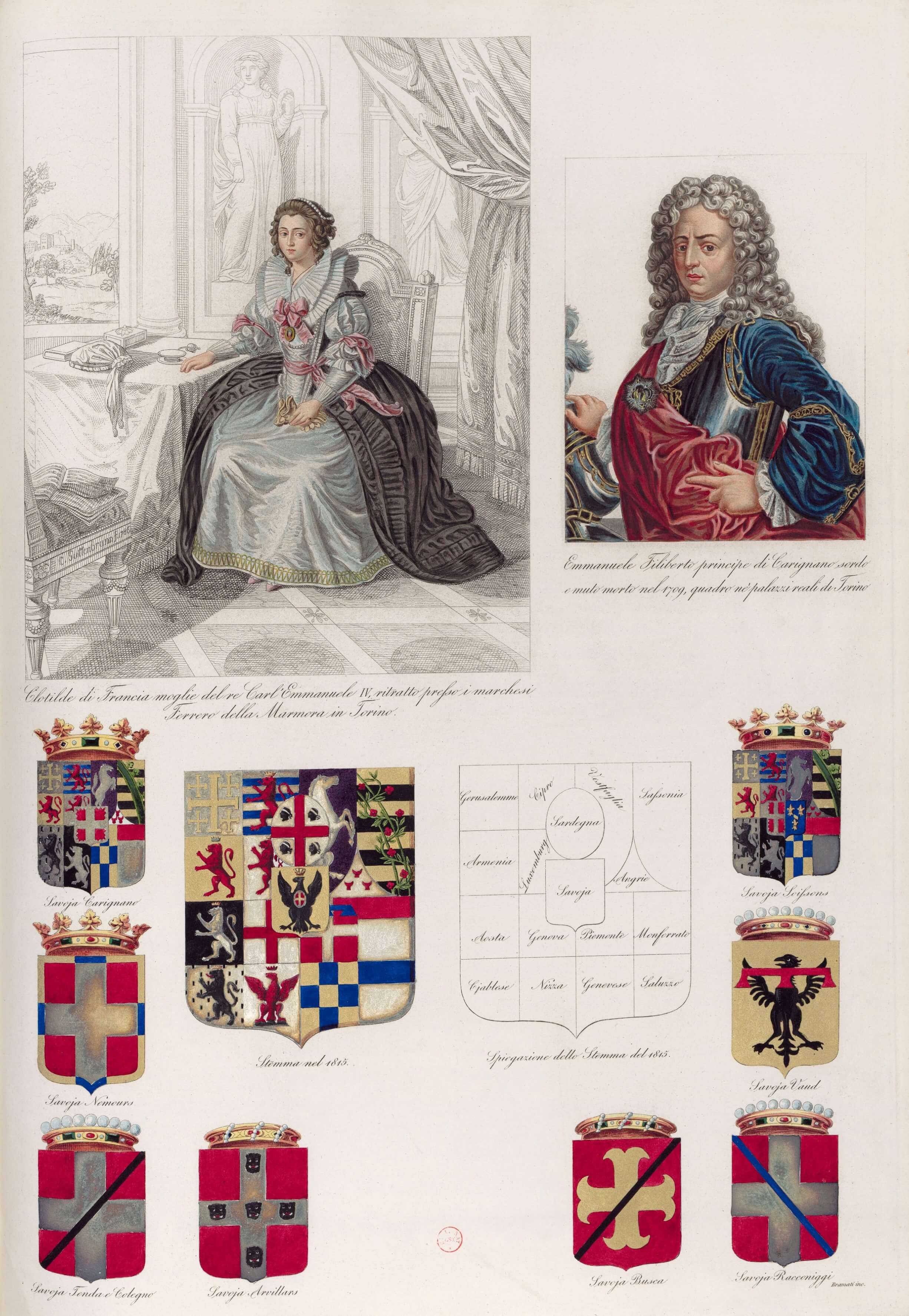 Clotilde of France, Emanuele Filiberto of Savoy- Carignano, and arms of the Savoy family and branches Engraving (detail), by Antonio Bramati, published 1819 Bibliothèque nationale de France, Paris
