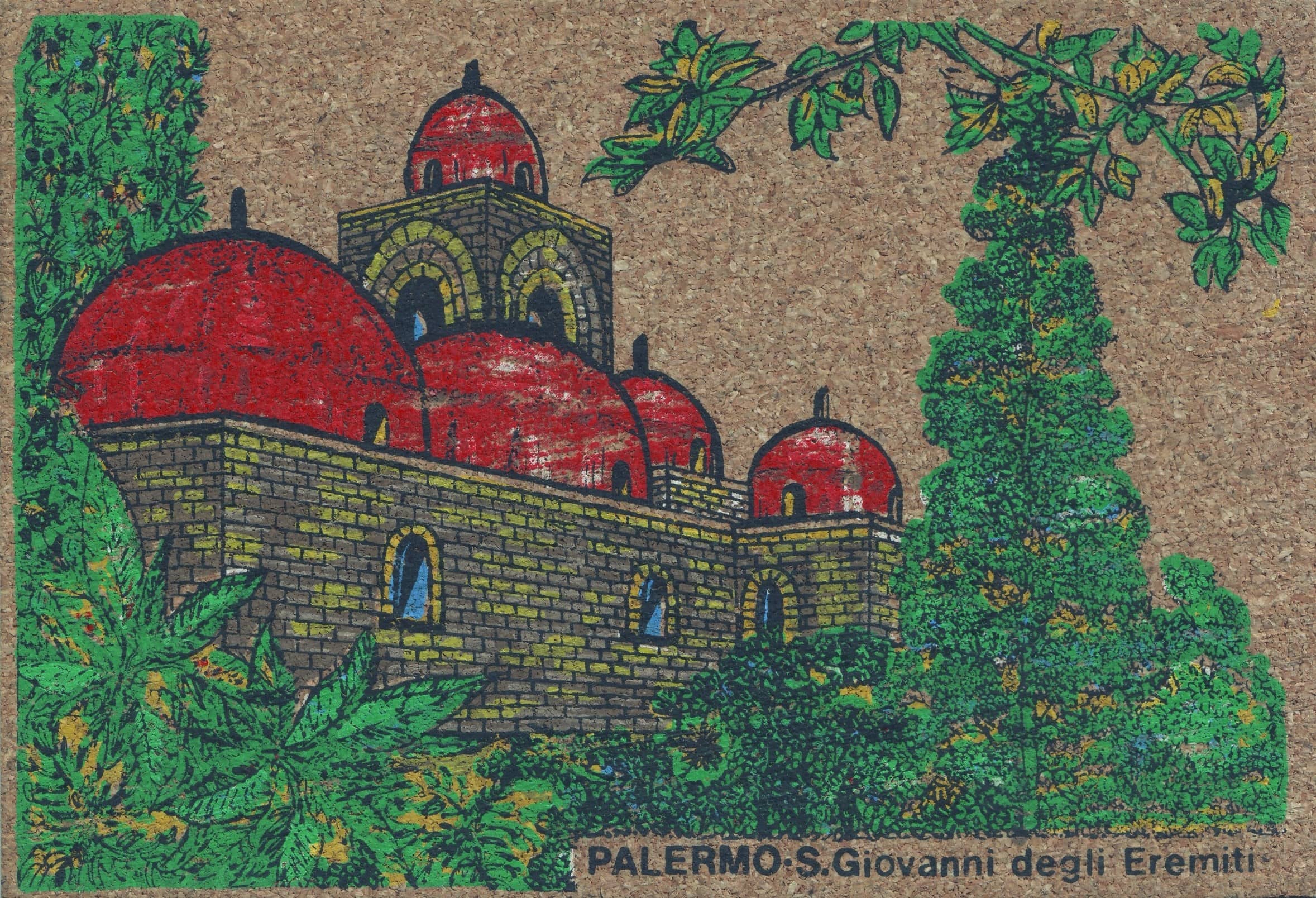 | A postcard made of cork depicting the church of San Giovanni degli Eremiti located in Palermo, Sicily, renowned for its blend of Norman, Arabic, and Byzantine architectural influences. The church was founded in the 6th century and later rebuilt in the 12th century, featuring distinctive red domes that reflect the region's diverse heritage |