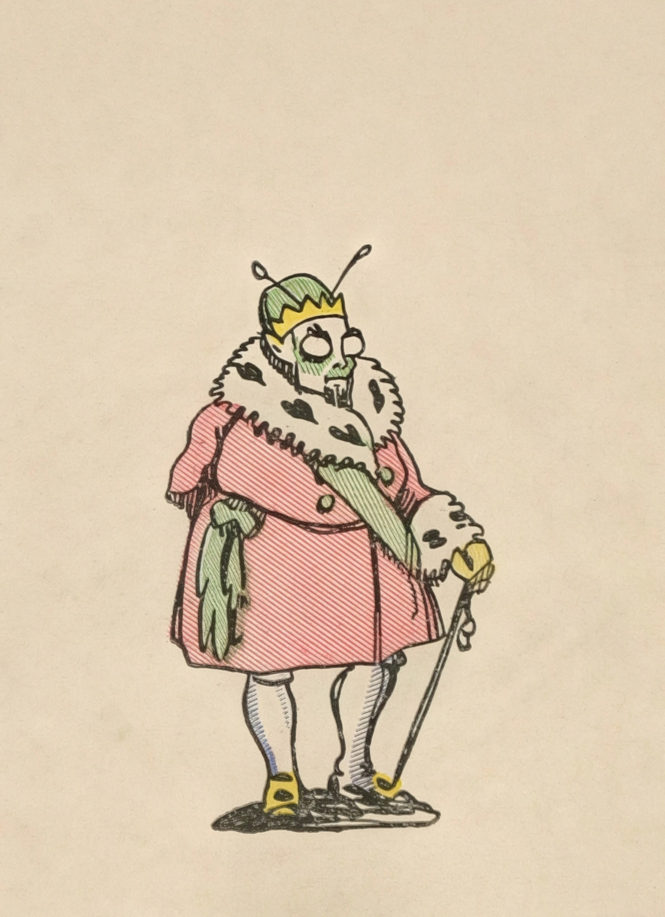 From the early nineteenth-century French folk tale The Luck of the Bean-Rows, by Charles Nodier, the King of the Crickets is an eccentric, insect-like figure who makes an absurdly dramatic declaration of love to Princess Pea-Blossom, whom she describes as appearing in a mask with horns and flinging himself upon her carriage. He is one of several grotesque suitors vying for her hand, capturing the tale’s blend of fairy-tale whimsy and theatrical satire. Though his role is brief, he forms part of the tale’s mix of dreamlike absurdity and theatrical menace. |
