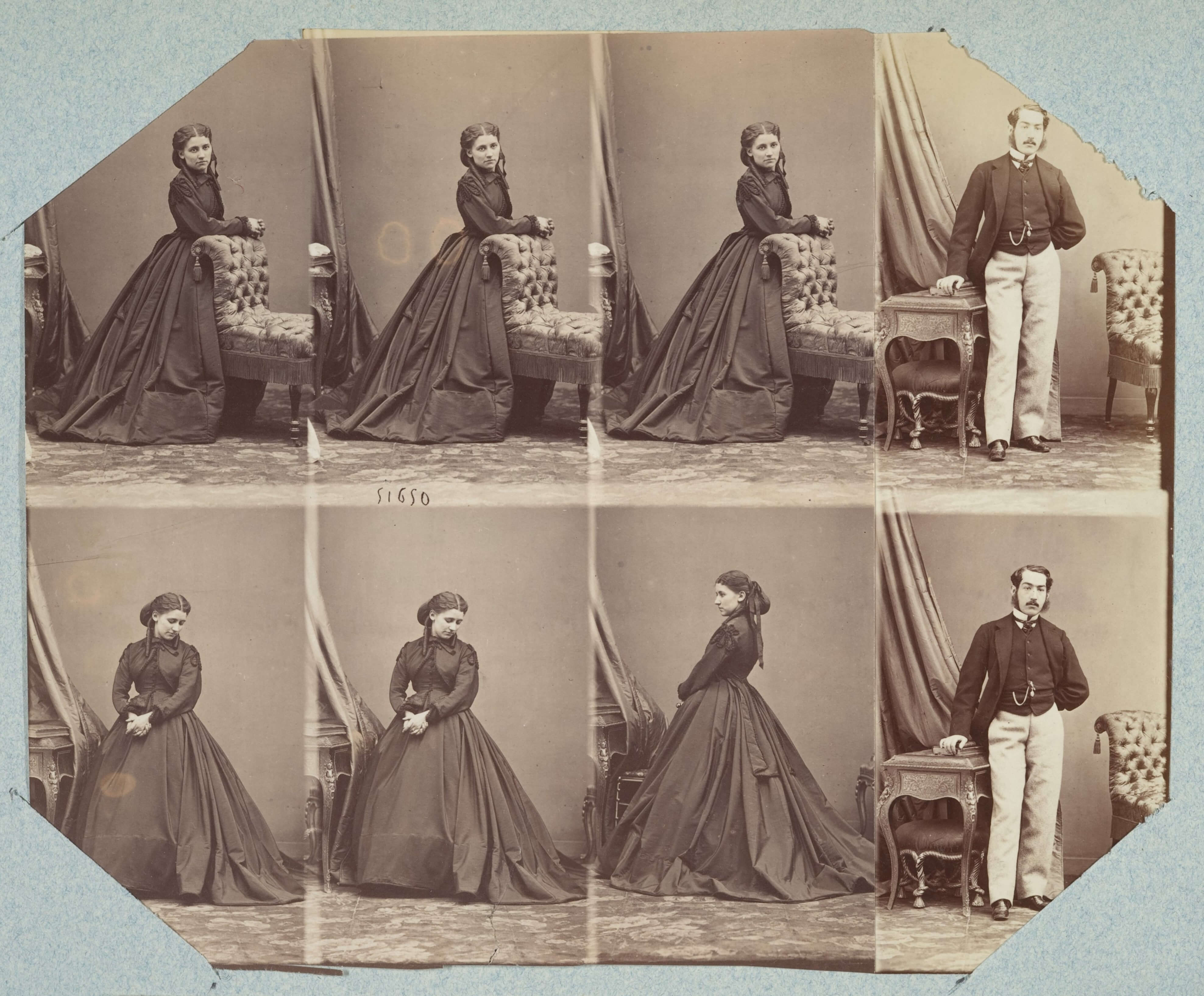 | The formal attire and poised demeanour of two individuals appears repeatedly as they alter pose, with some variation, emphasising fashion and social presentation. Presentation becomes a study in character, gesture, and dress as something tried, adjusted, and assessed within the studio setting, drawing attention to photography as a site of testing, rehearsal, and manufactured appearance. |