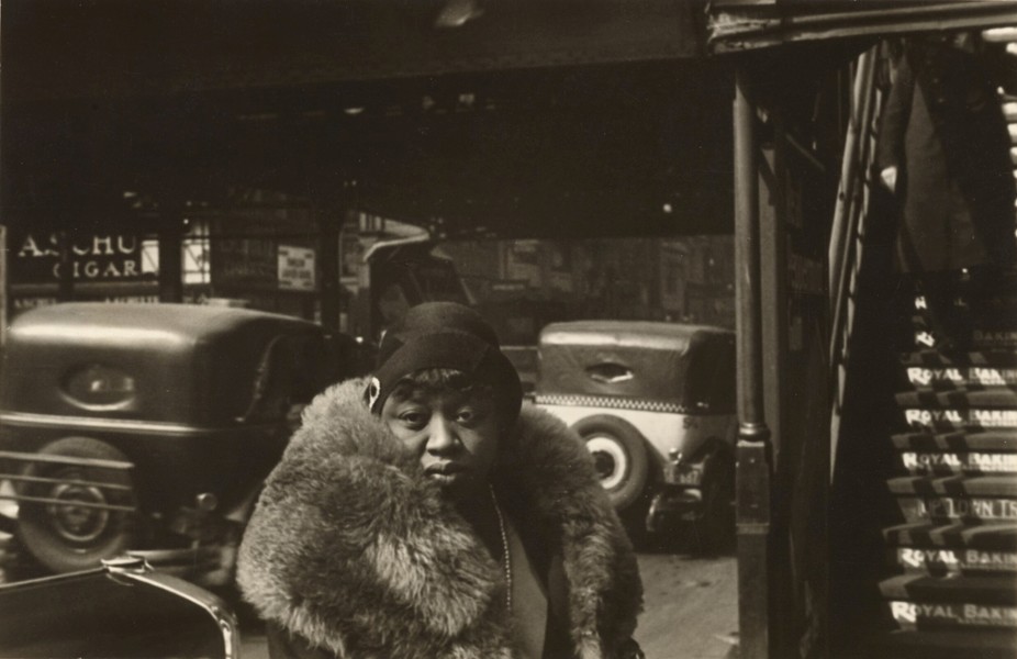 | A weary face emerges from a sea of fur amidst the bustling cityscape. This image, a classic Walker Evans street portrait, captures a fleeting moment of human experience amid the everyday pandemonium. Composed with the steel jaws of an elevated train entrance looming on the right, the photograph's frame echoes the urban pressure that seems to weigh on the subject. Evans, a master of capturing these candid encounters, leaves us wondering about the story behind the tired eyes and the luxurious fur collar, a poignant juxtaposition in the concrete jungle. |