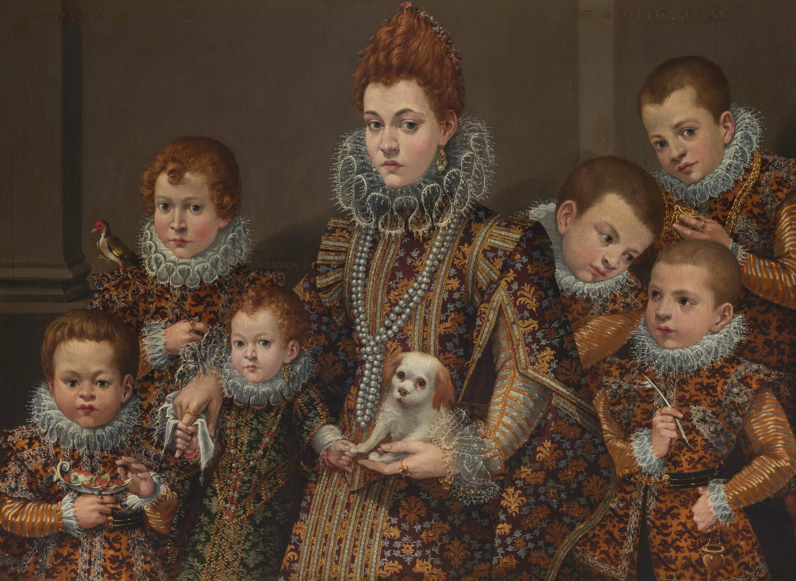 | Bianca, a Roman noblewoman, gave birth to nineteen children during her lifetime. These are the six who survived. The family is adorned in magnificent attire of extraordinary richness, most of the children holding symbolic objects, as Bianca holds a small dog. These carefully chosen props convey allegorical significance related to the moral qualities of each individual portrayed. |