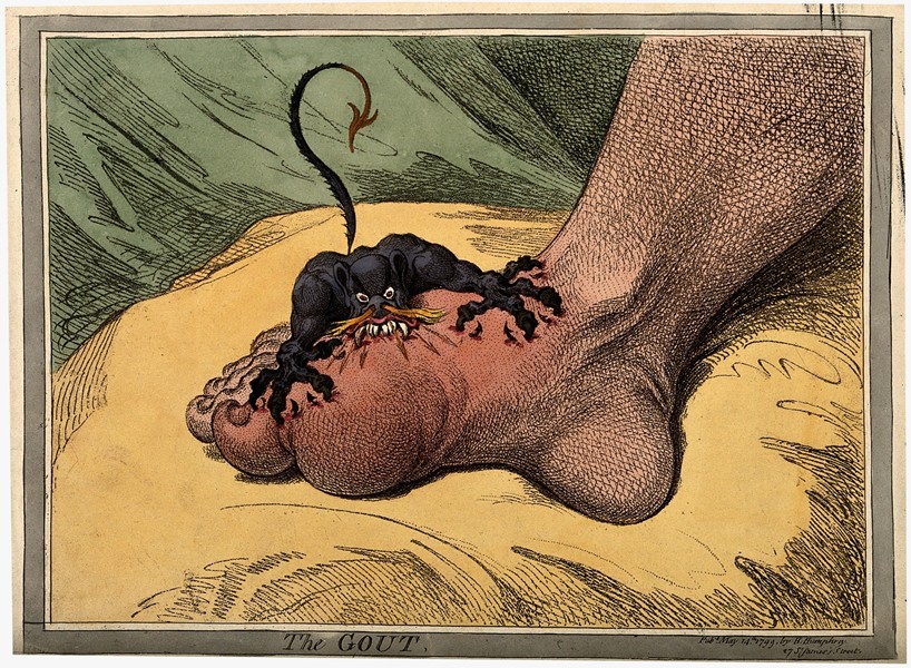 The Gout Soft-ground etching and aquatint, with watercolour; 25.6 x 35 cm, by James Gillray, published 1799 Wellcome Collection, London |