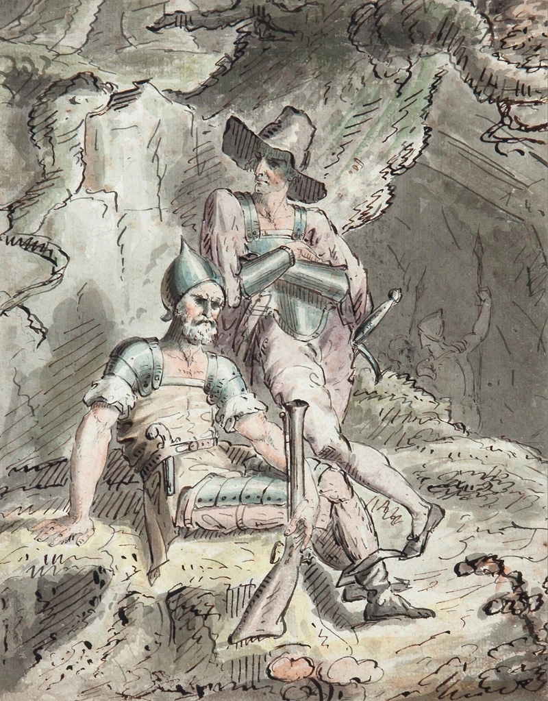 Two armoured soldiers rest amidst a rugged, rocky landscape, a brief respite from their duties while remaining in a state of watchful readiness. Soldiers as a subject matter accords with Hamilton's inclination for dramatic, narrative scenes where figures are posed with a distinctly stage-like elegance even within austere settings. |