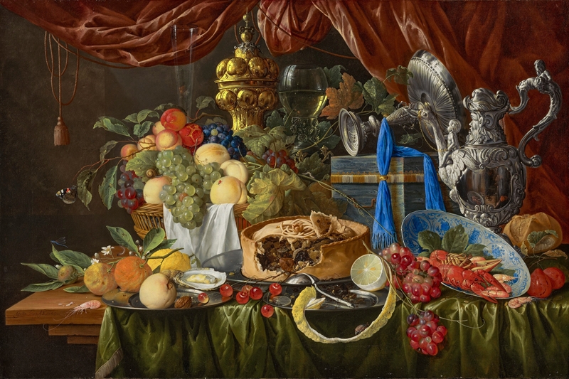 | A golden pie sits at the centre of an opulent spread, surrounded by glistening fruit, fine glassware, and rich fabrics, all depicted with striking clarity. The composition exemplifies the pronkstilleven genre, a sumptuous still life tradition that flourished during the Dutch Golden Age to celebrate material abundance. The painting employs a detailed and illusionistic style, capturing textures with acute precision—fruit skins gleam, glass reflects light precisely, and the pastry crumbles delicately at its edge. This visual intensity creates a heightened realism that draws the viewer into the scene’s excess. Beneath the surface splendour, however, details such as the peeled lemon and wilting flowers introduce subtle signs of deterioration, offering a quiet meditation on transience and the impermanence of earthly pleasures. |