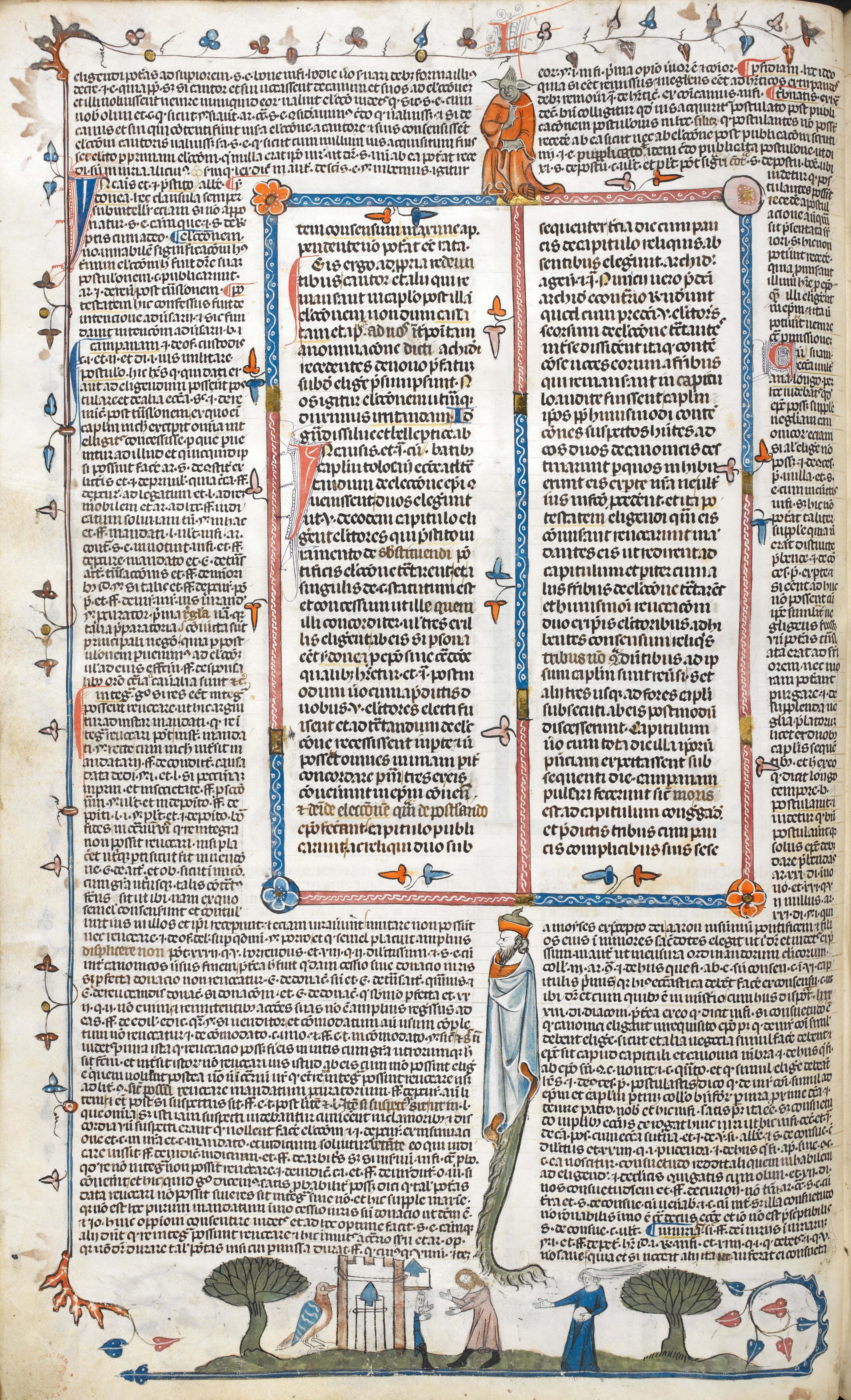 Two human-animal hybrid figures (top and lower-centre); a man and a woman outside a building from which emerges another man (bas-de-page scene). he manuscript, Decretals of Gregory IX, Royal 10 E IV, is a canonical law collection issued under the authority of Pope Gregory IX and compiled for him by Raymond of Peņafort (or Penyafort), a Dominican friar and distinguished jurist. Bernard of Parma compiled the Glossa ordinaria, the standard authoritative commentary used by canon lawyers, in the margins. |