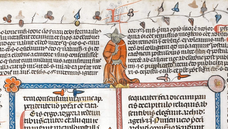 A marginalia figure of a human–animal hybrid, which has been described as a ‘Yoda figure’ because of its large, pointed ears, expressive face, and slightly hunched posture, has attracted attention in recent years. The manuscript, Decretals of Gregory IX, Royal 10 E IV, is a canonical law collection issued under the authority of Pope Gregory IX and compiled for him by Raymond of Peņafort (or Penyafort), a Dominican friar and distinguished jurist. Bernard of Parma compiled the Glossa ordinaria, the standard authoritative commentary used by canon lawyers, in the margins. |