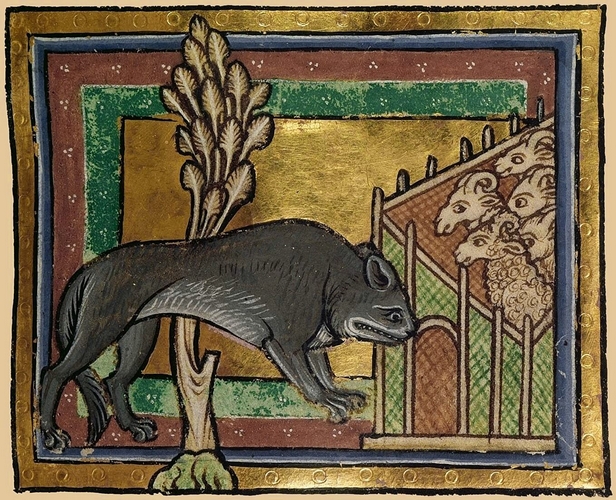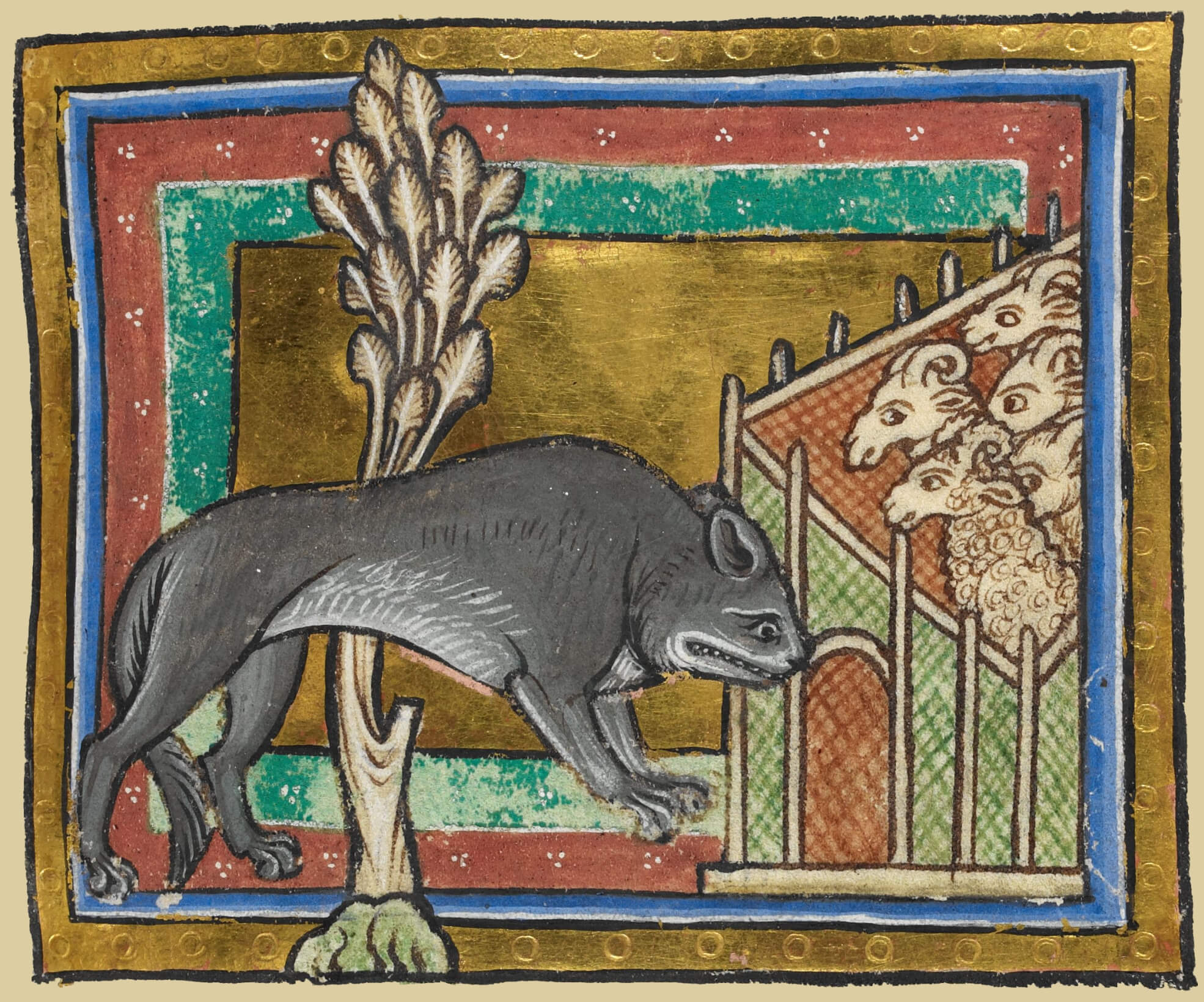 Miniature of a wolf approaching a sheepfold