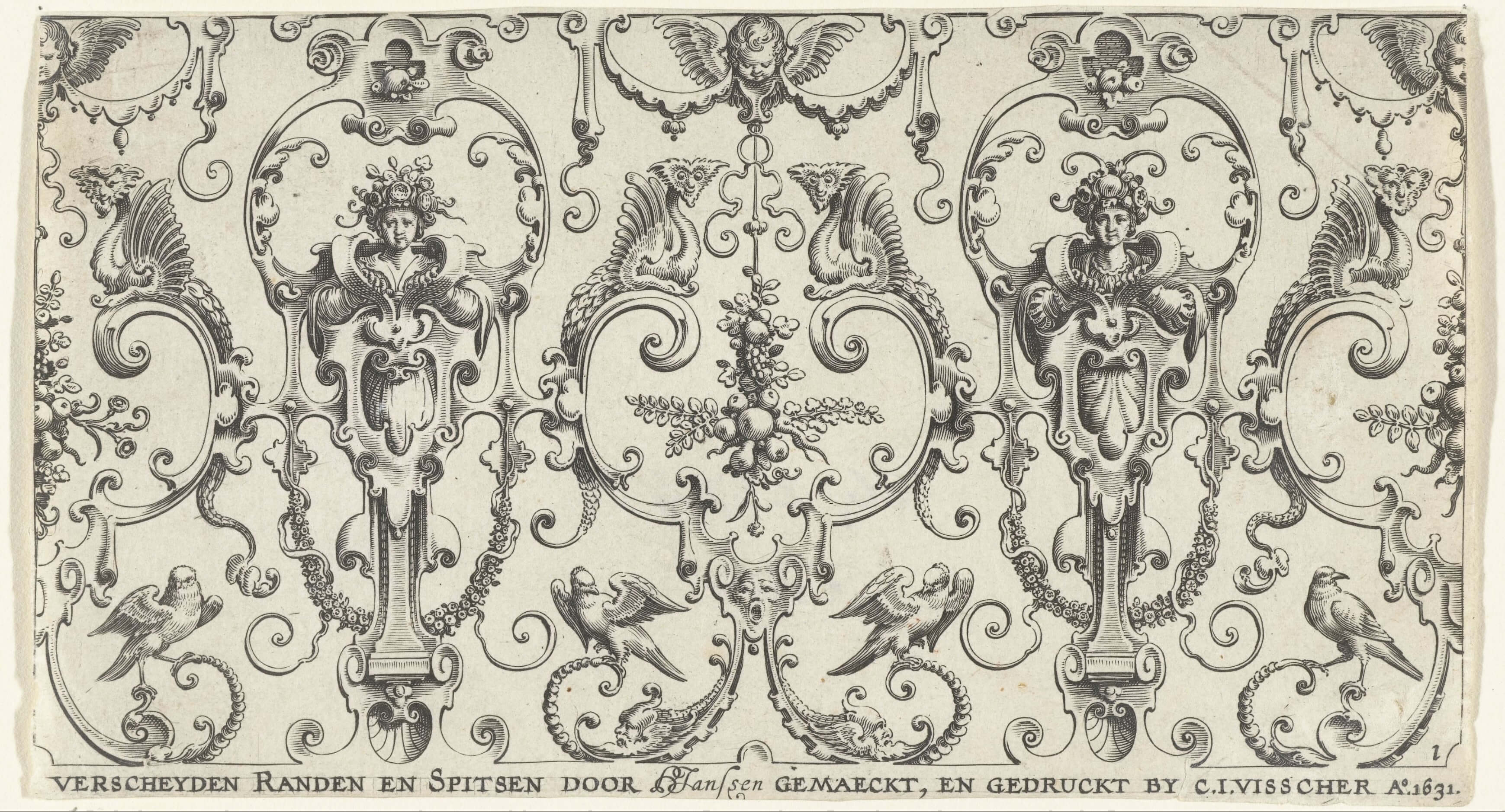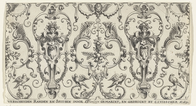Border decoration with baluster motifs featuring two female heads, birds, cherubs and monsters Engraving print by Hans Janssen, 1631