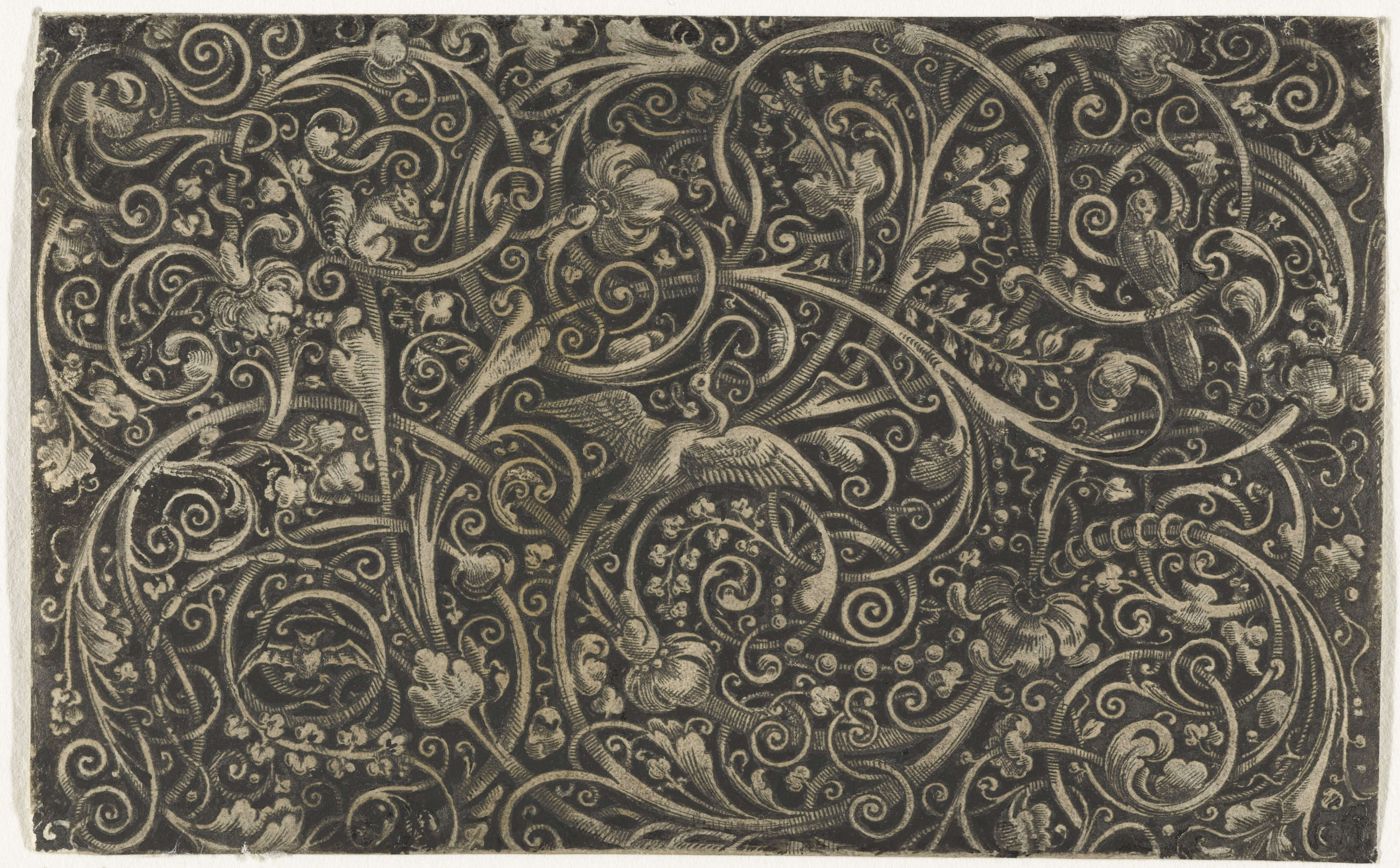 Among the leafy tendrils in this ornamental panel are a heron, a parrot,