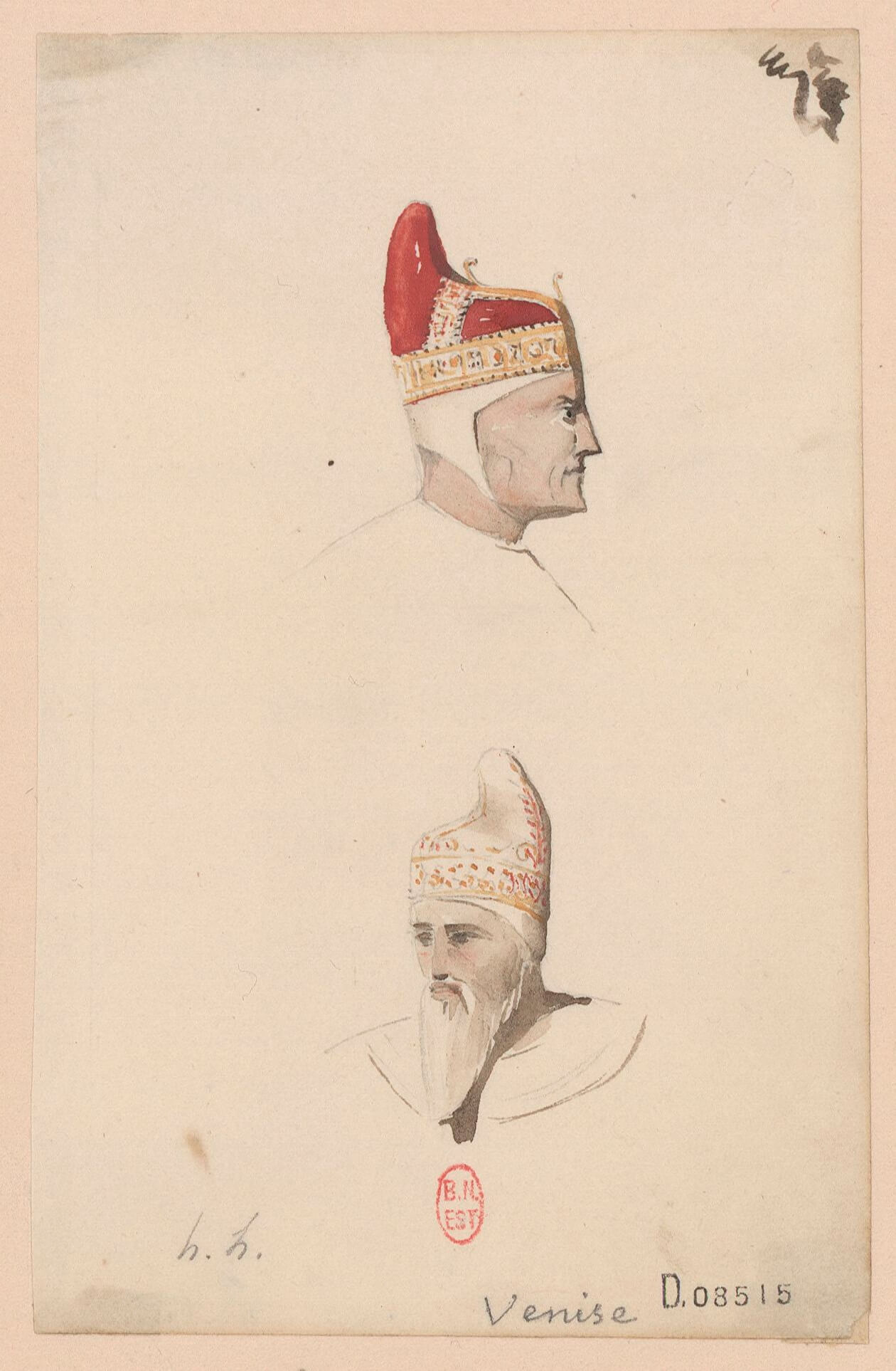 Heads of two doges of Venice Graphite, pencil, coloured wash on paper By Henri Labrouste, 1825-30