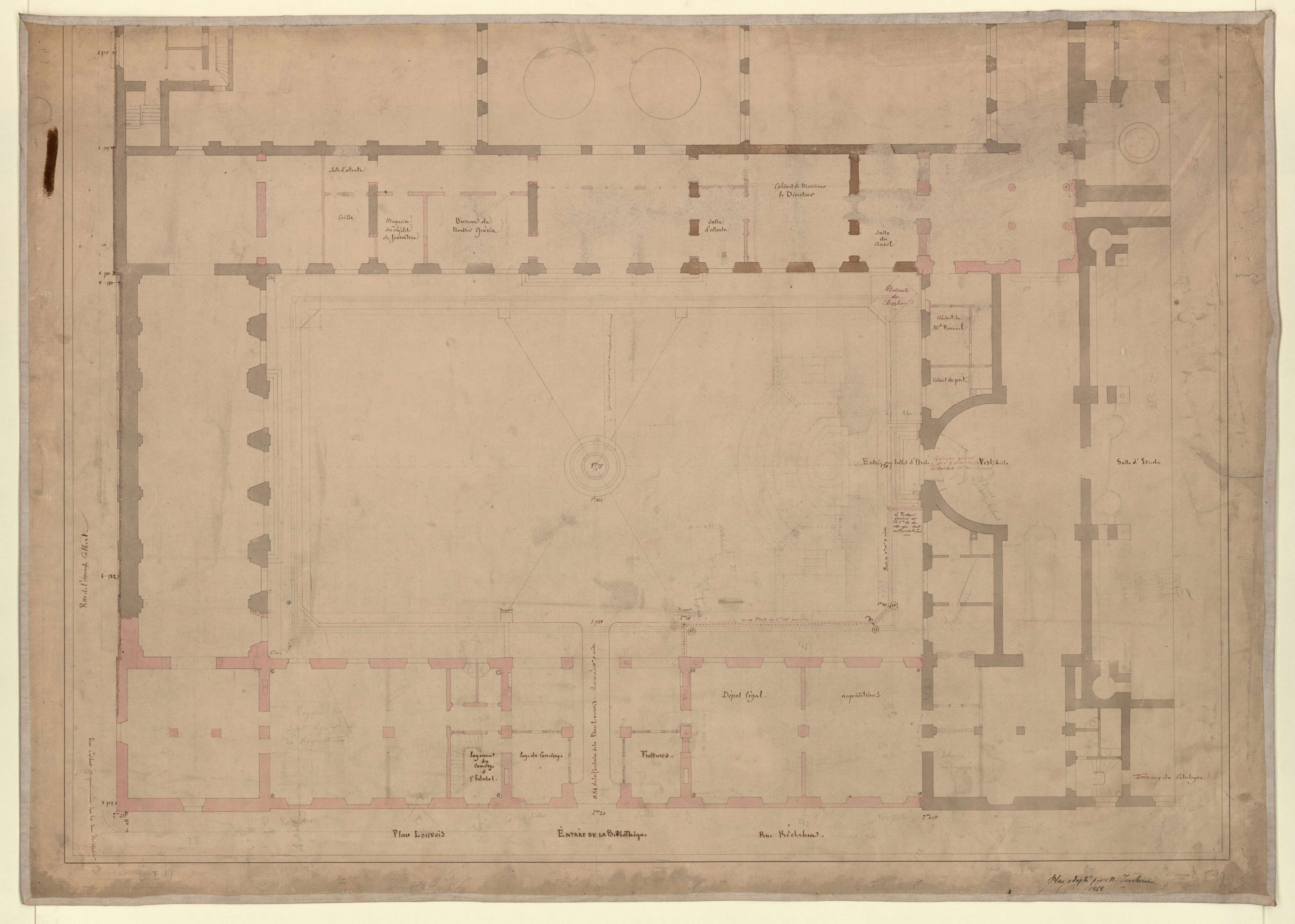 Drawing plan of the Bibliothèque impériale (buildings near the courtyard) Pencil, pen, ink, gray and pink wash on paper, by Henri Labrouste, 1868 Bibliothèque nationale de France