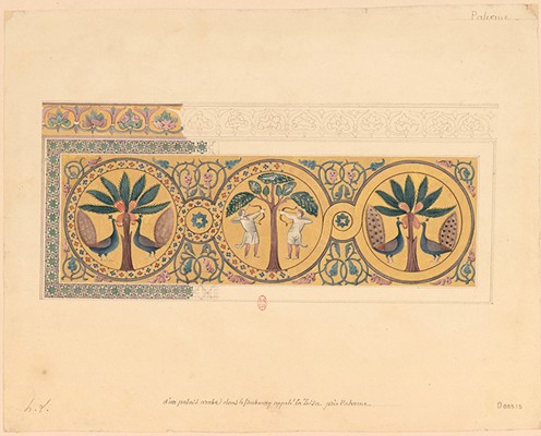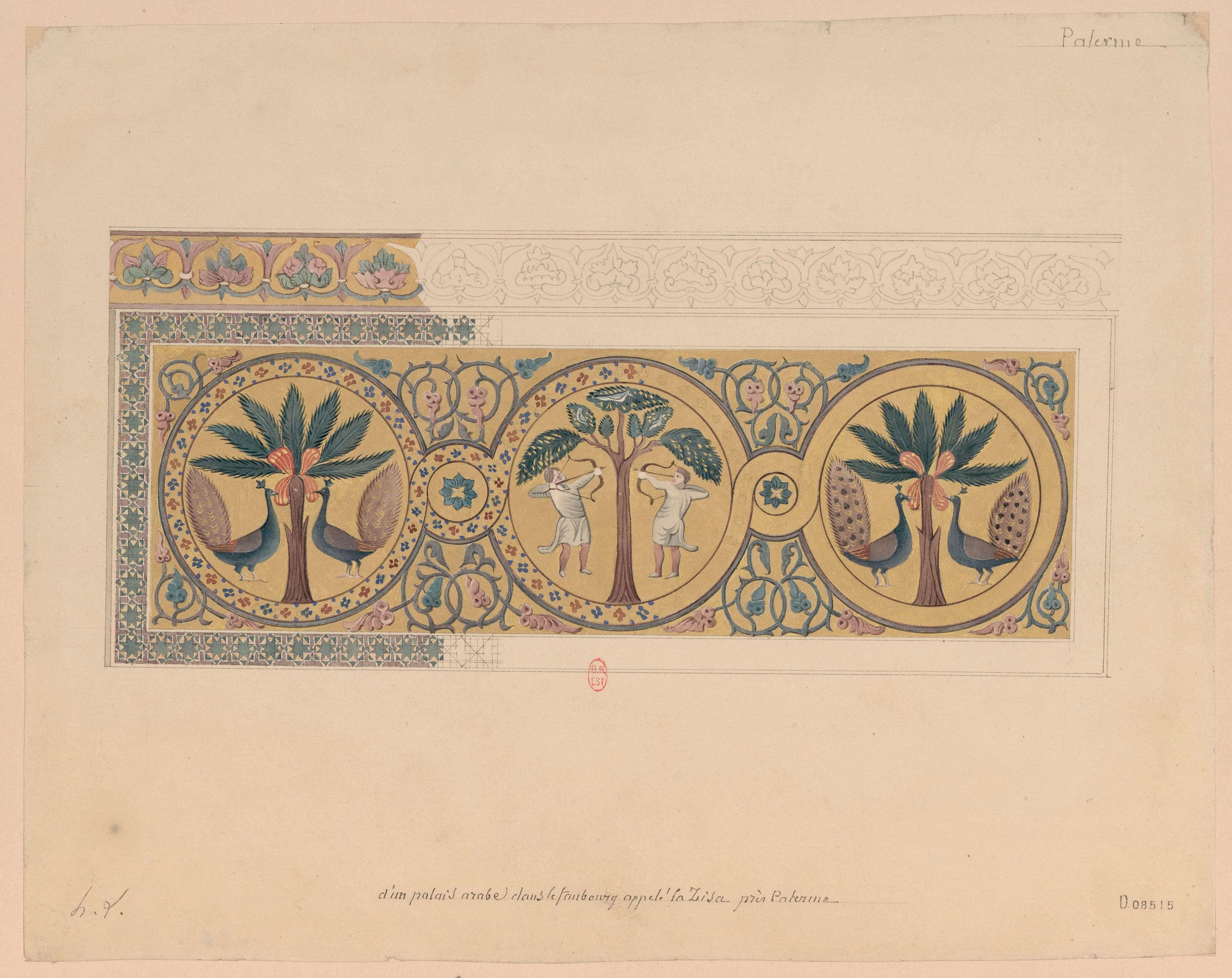Mural mosaics from the Arab-Norman Palazzo di Zisa, Palermo Graphite, pencil, coloured wash on paper, by Henri Labrouste, 1828 Bibliothèque nationale de France