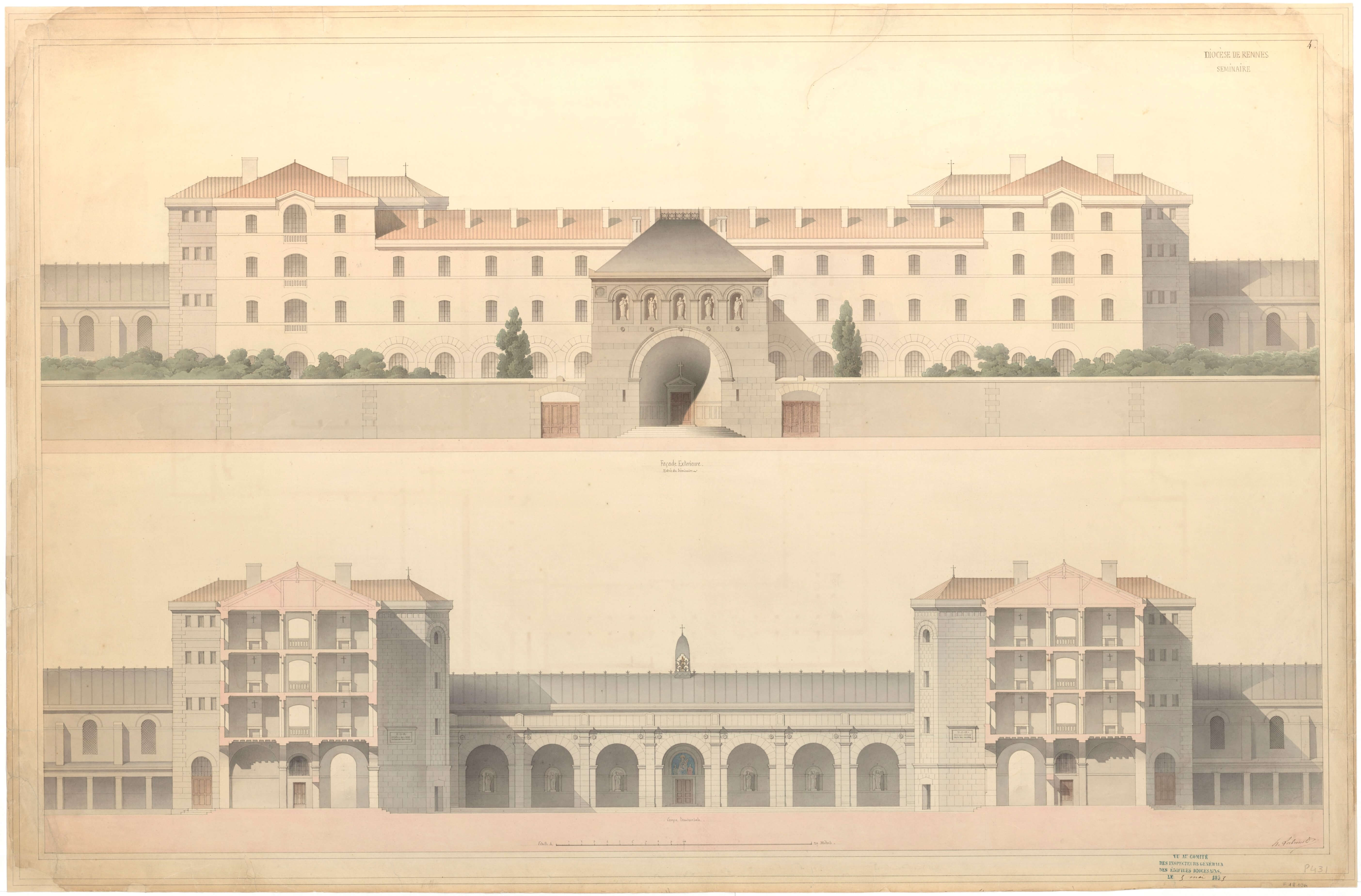 Project for a new seminary for the Diocese of Rennes: ground floor plan Pencil, pen, black and red ink, black and grey wash on paper By Henri Labrouste, 1856. Bibliothèque nationale de France.