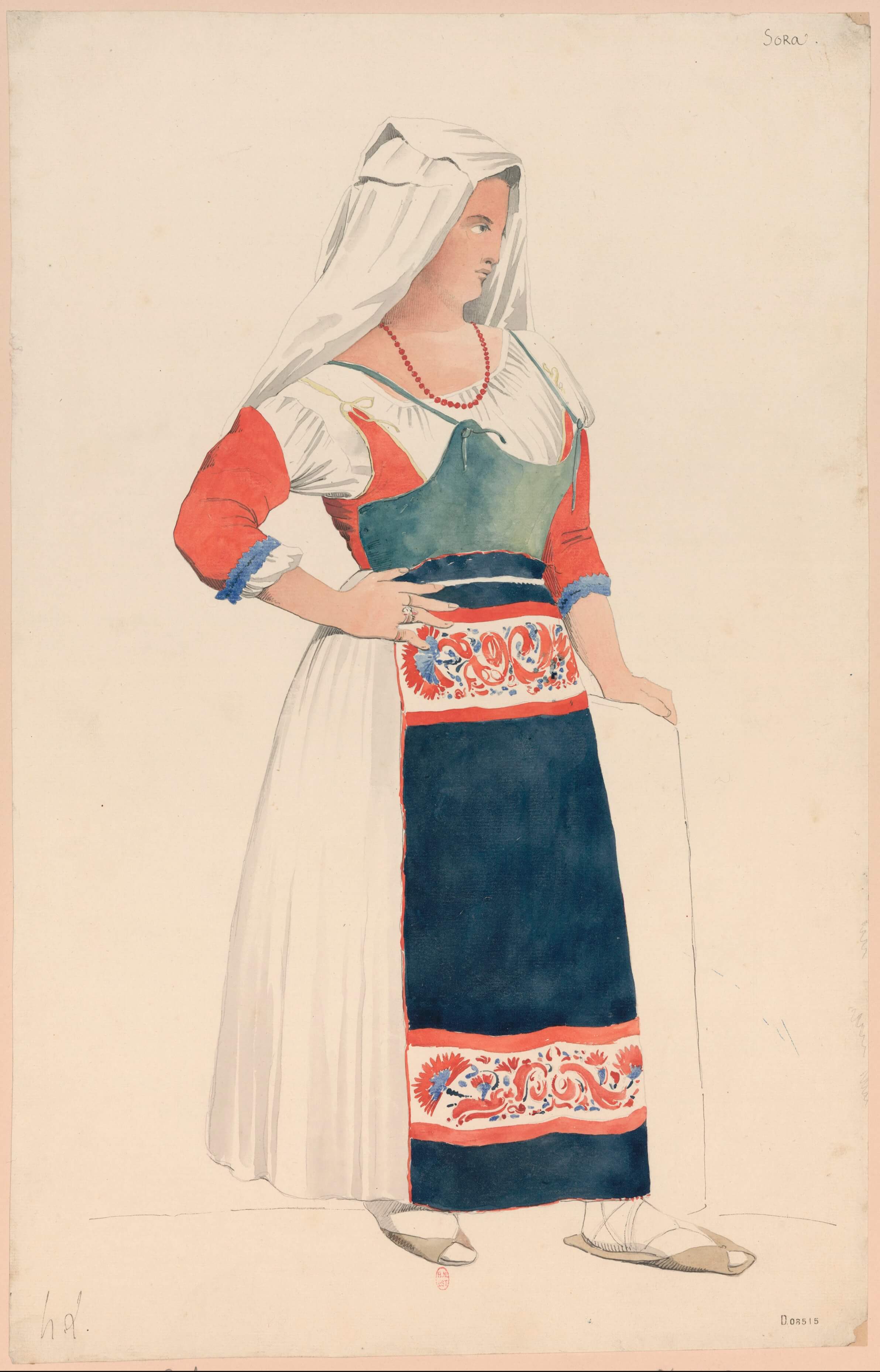Peasant woman in traditional dress from Sora, Frosinone Graphite, pencil, coloured wash on paper, by Henri Labrouste, 1825-30 Bibliothèque nationale de France