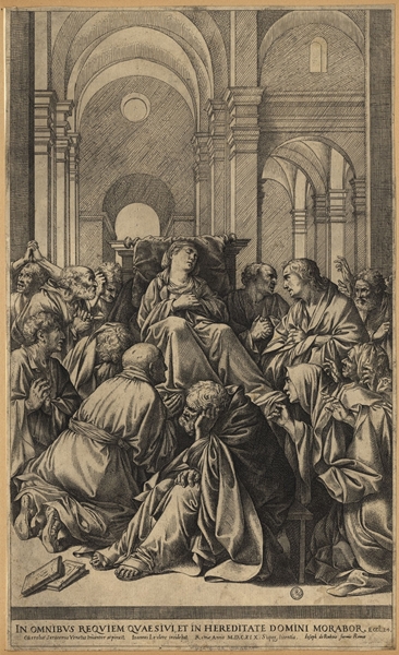 Death of the Virgin 'In omnibus requiem quaesivi, et in hereditate Domini morabor.' Ecclus. xxiv. 11 (In all these I sought rest, and I shall abide in the inheritance of the Lord.) Engraving by Jean LeClerc, 1619 Biblioteca Nacional de Portugal